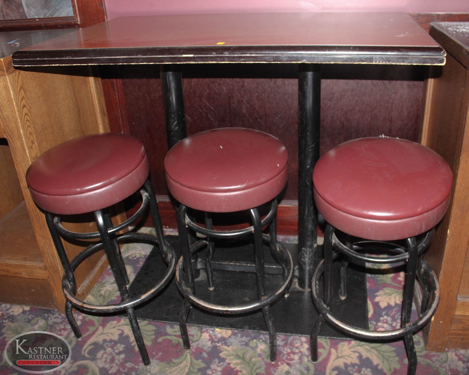 48" X 30" WOOD TABLE WITH 3 PADDED BAR STOOLS