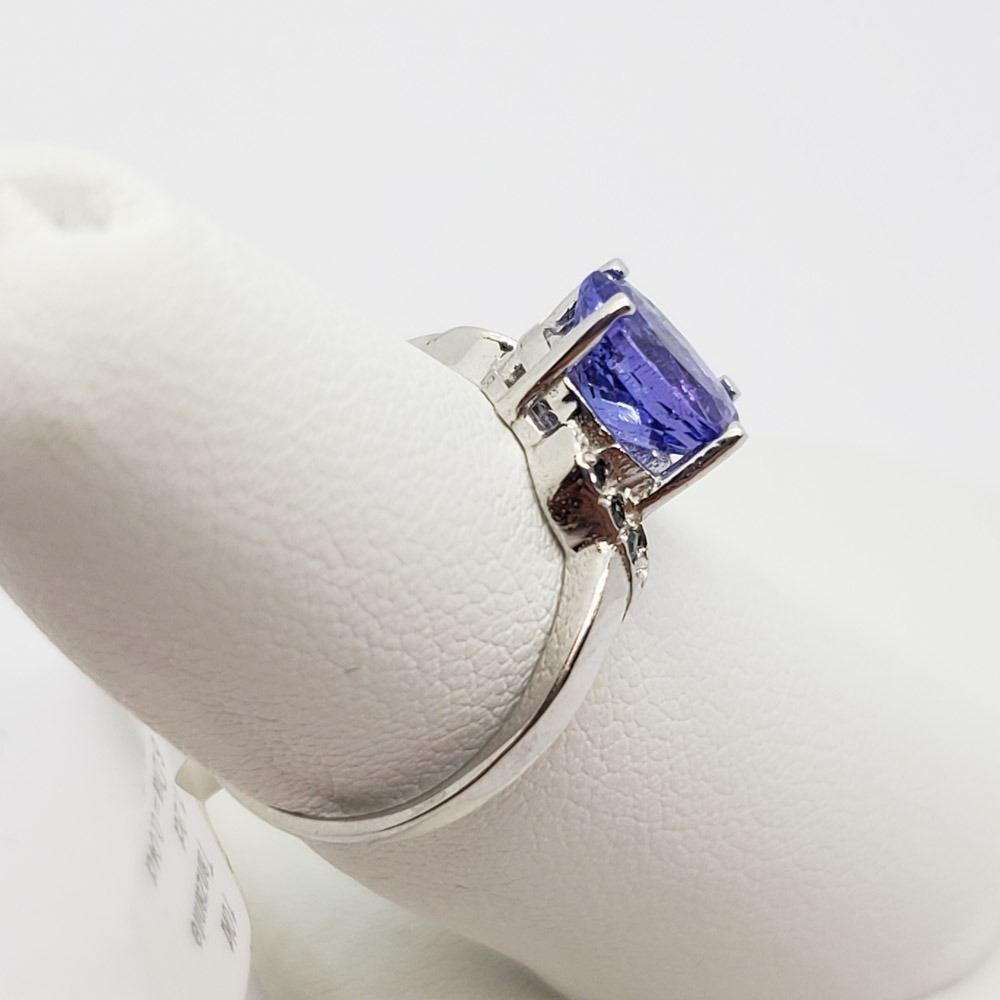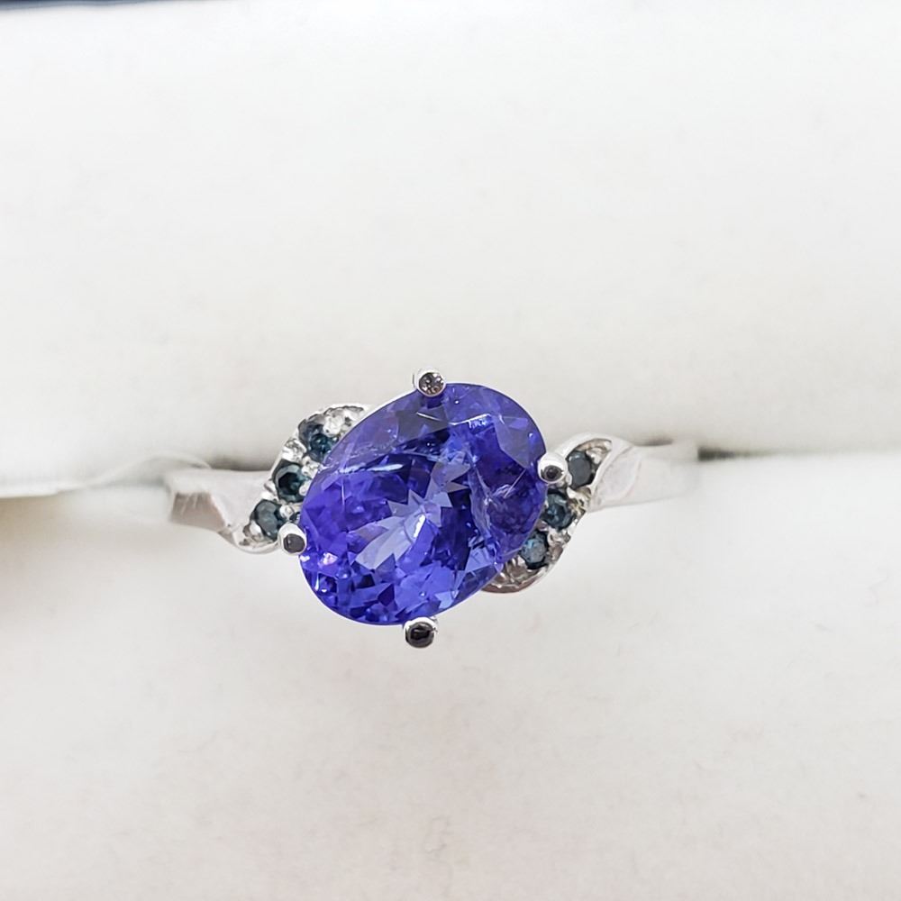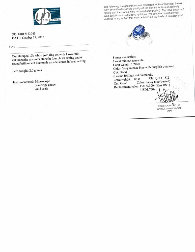 149 - JT52 - 10K WHITE GOLD TANZANITE (1.2CTS) 6 BLUE DIAMOND(0.04CTS.) RING (~SIZE 6.5) (~WEIGHT 2G), MADE IN CANADA W/COA. SUGGESTED REPLACEMENT VALUE $2300.00. APPRAISAL NOT FROM A LOCAL VERIFIED APPRAISER. JEWELRY