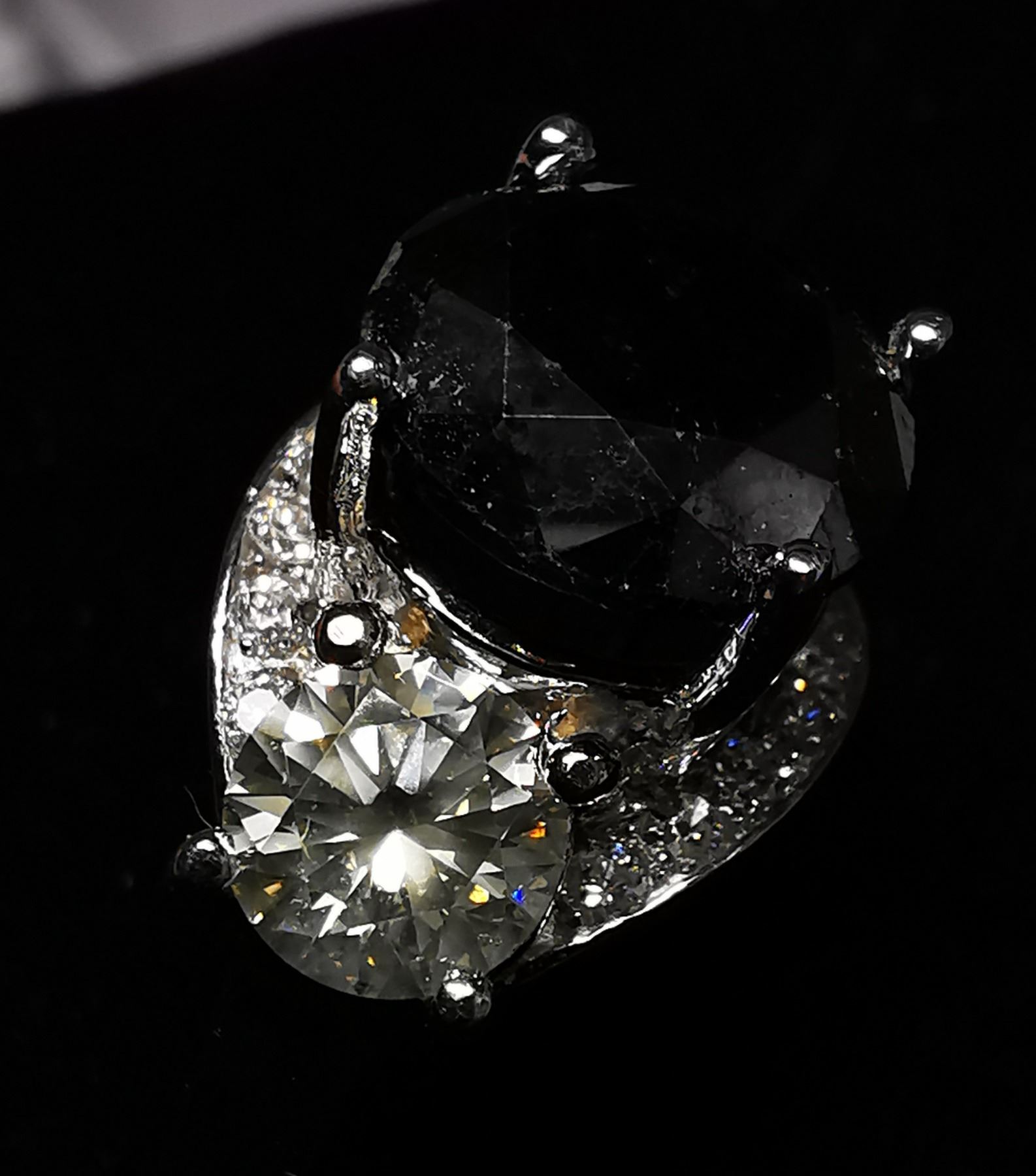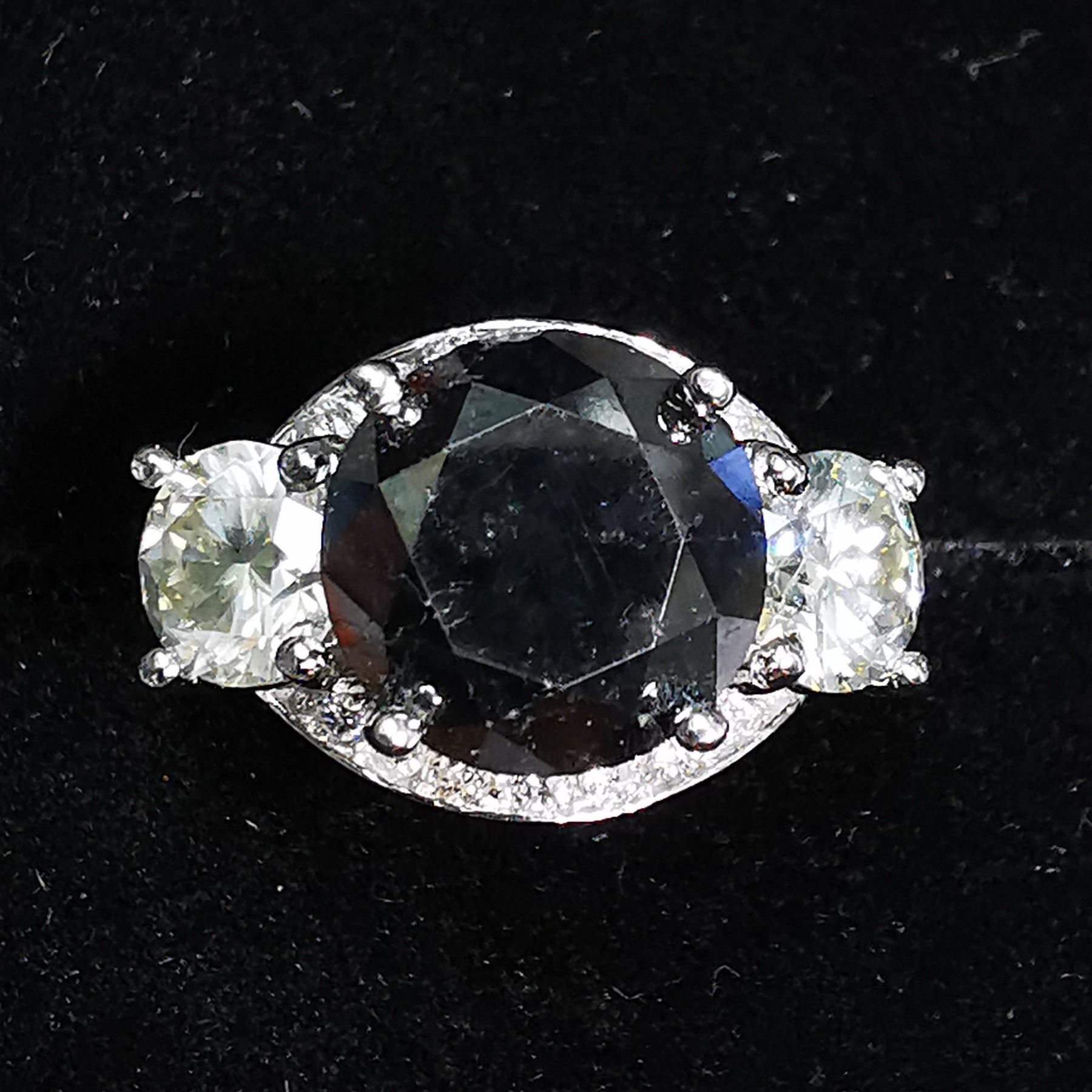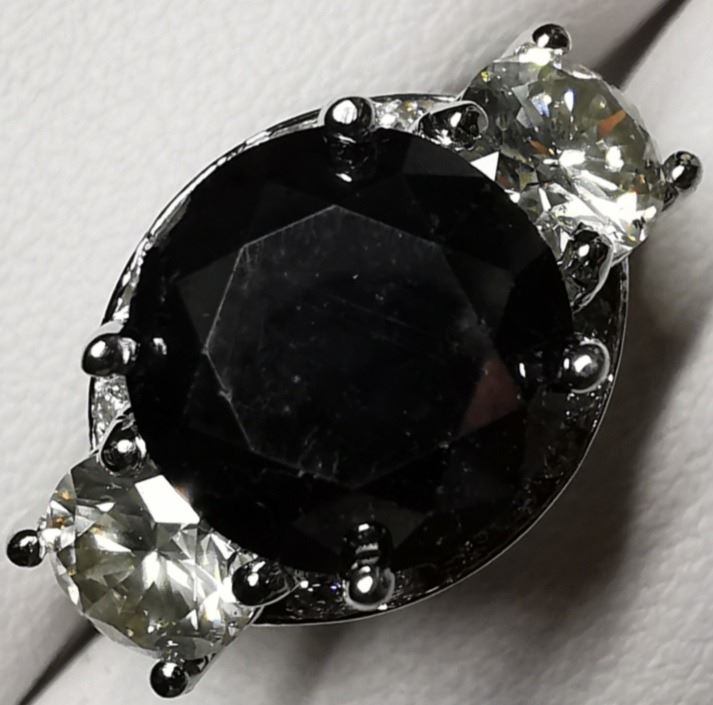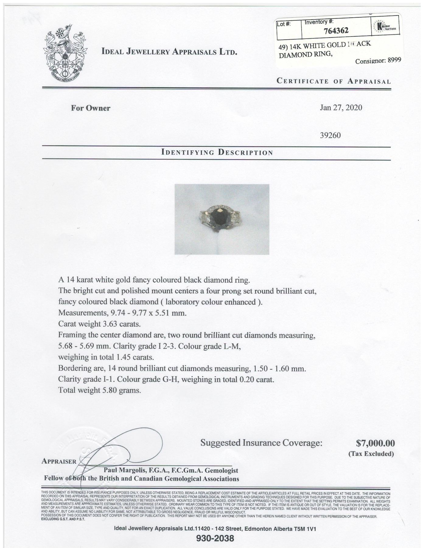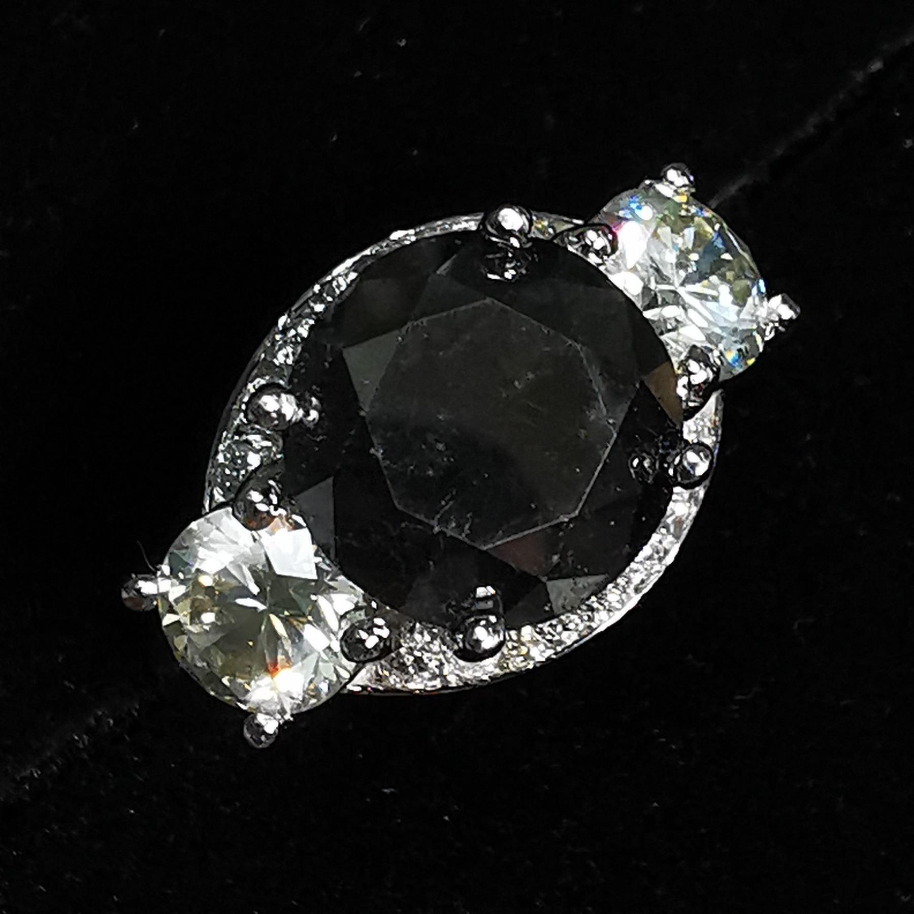 SIZE 6.75, ONE ROUND BRILLIANT CUT FANCY COLORED BLACK DIAMOND (LAB COLOR ENHANCED, MEASURING 9.74 - 9.77 X 5.51 MM, WEIGHING 3.63 CARATS), TWO ROUND BRILLIANT CUT DIAMONDS (MEASURING 5.68 - 5.69 MM, CLARITY GRADE I 2-3, COLOR GRADE L-M, WEIGHING 1.45 CARATS), 14 ROUND BRILLIANT CUT DIAMONDS (MEASURING 1.50 - 1.60 MM, CLARITY GRADE I-1, COLOR GRADE G-H, WEIGHING 0.20 CARATS). COMES WITH CERTIFICATE OF APPRAISAL FROM LOCAL APPRAISER, SUGGESTED INSURANCE COVERAGE $7000.00. JEWELLERY