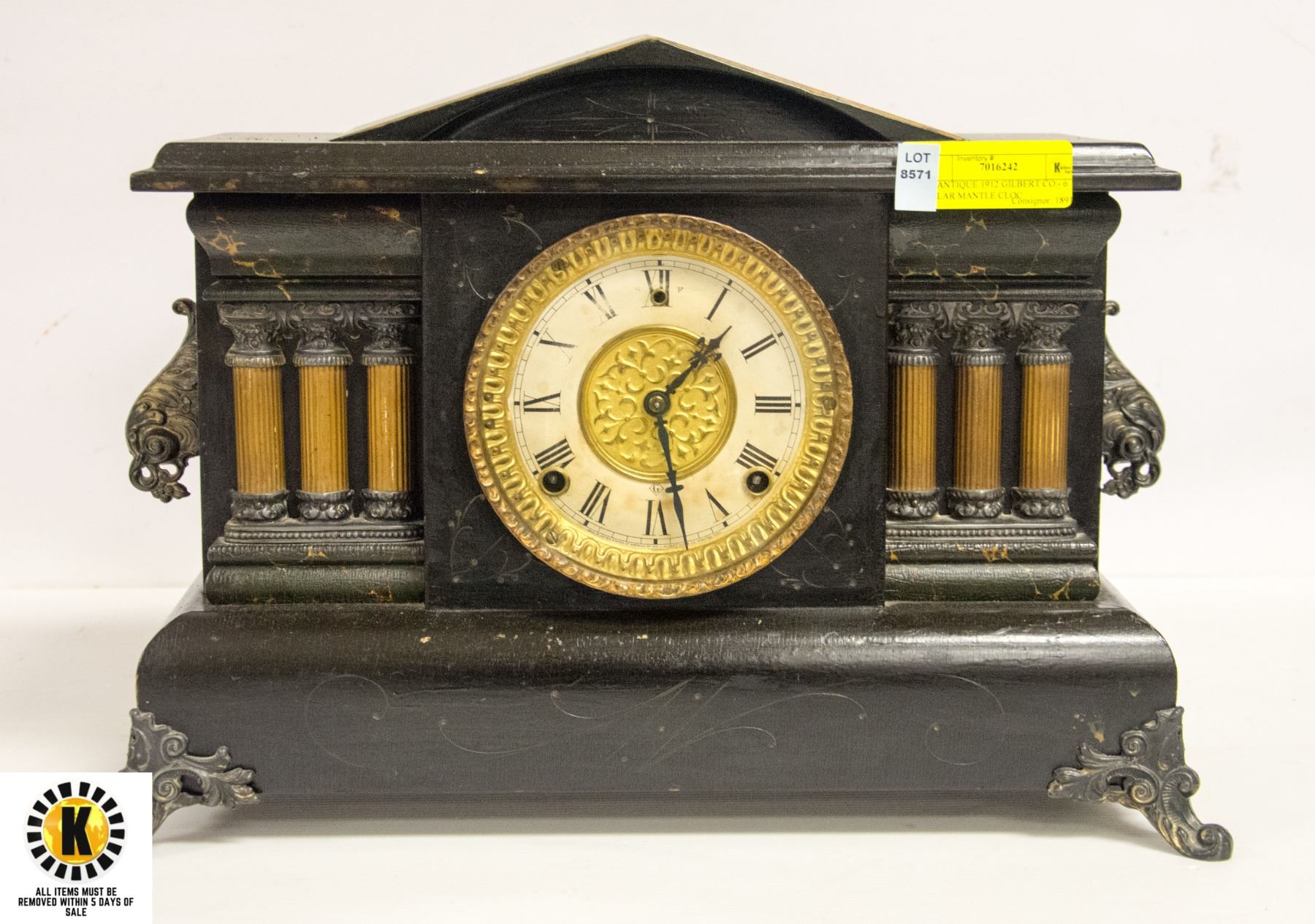 ANTIQUE 1912 GILBERT CO.- 6 PILLAR MANTLE CLOCK WITH KEY