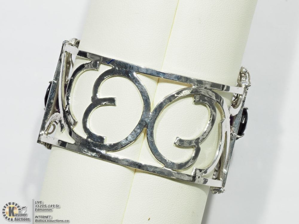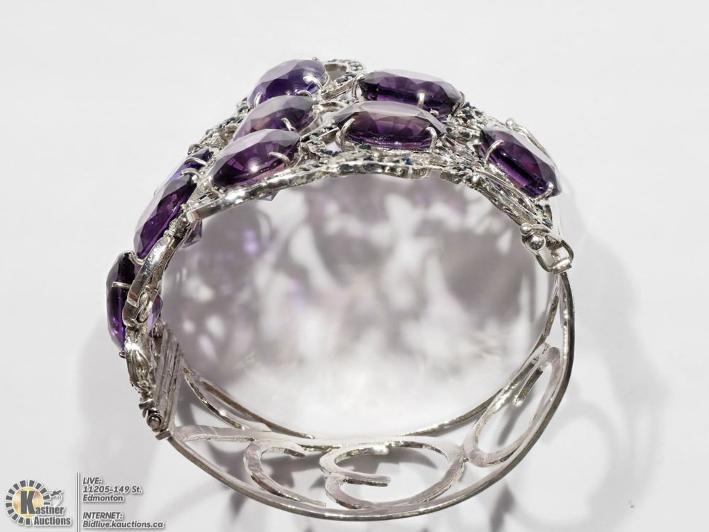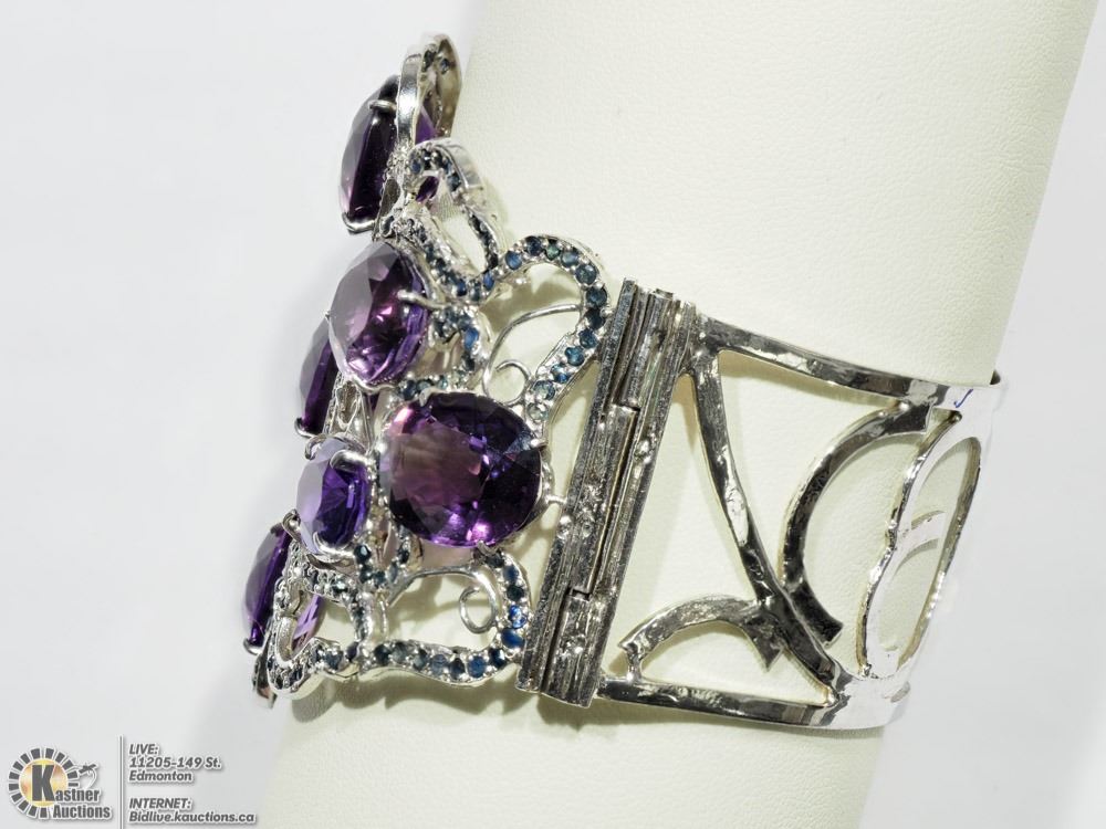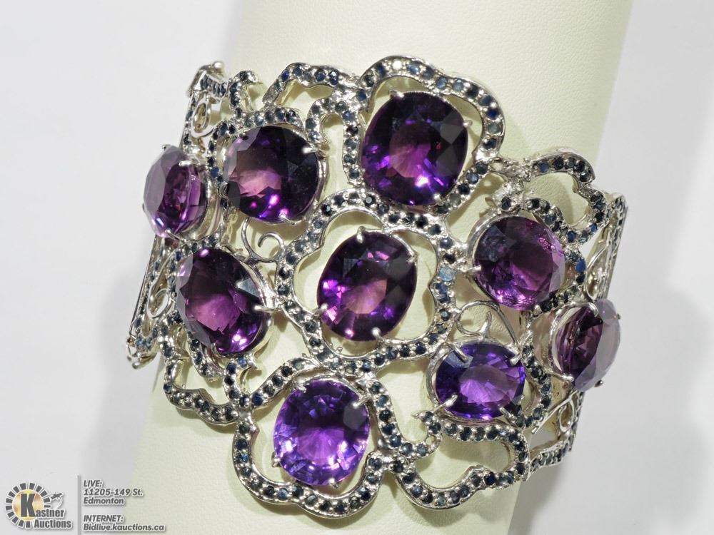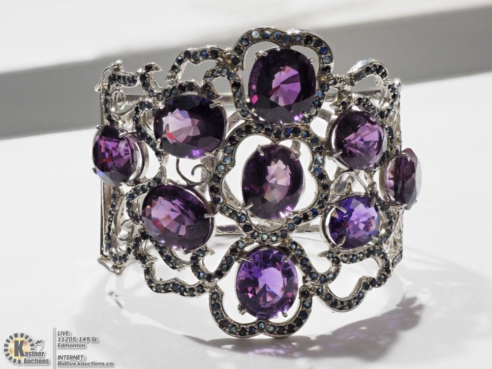 STERLING SILVER AMETHYST(78.0CT) & 273 SAPPHIRES BANGLE BRACELET. W/ COA - SUGGESTED RETAIL VALUE $3,700.00