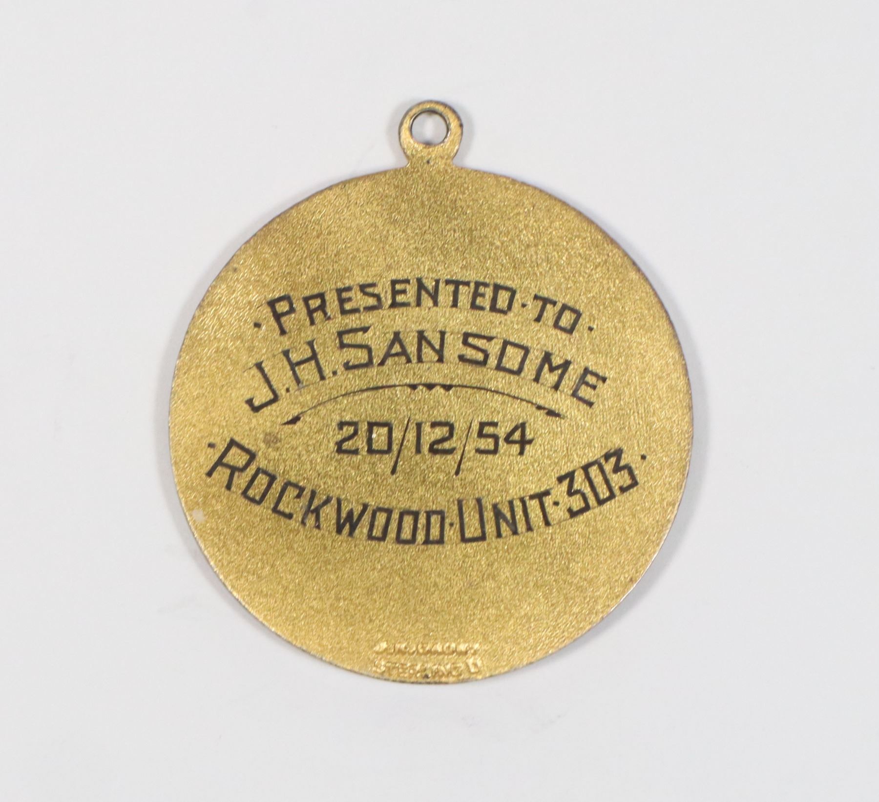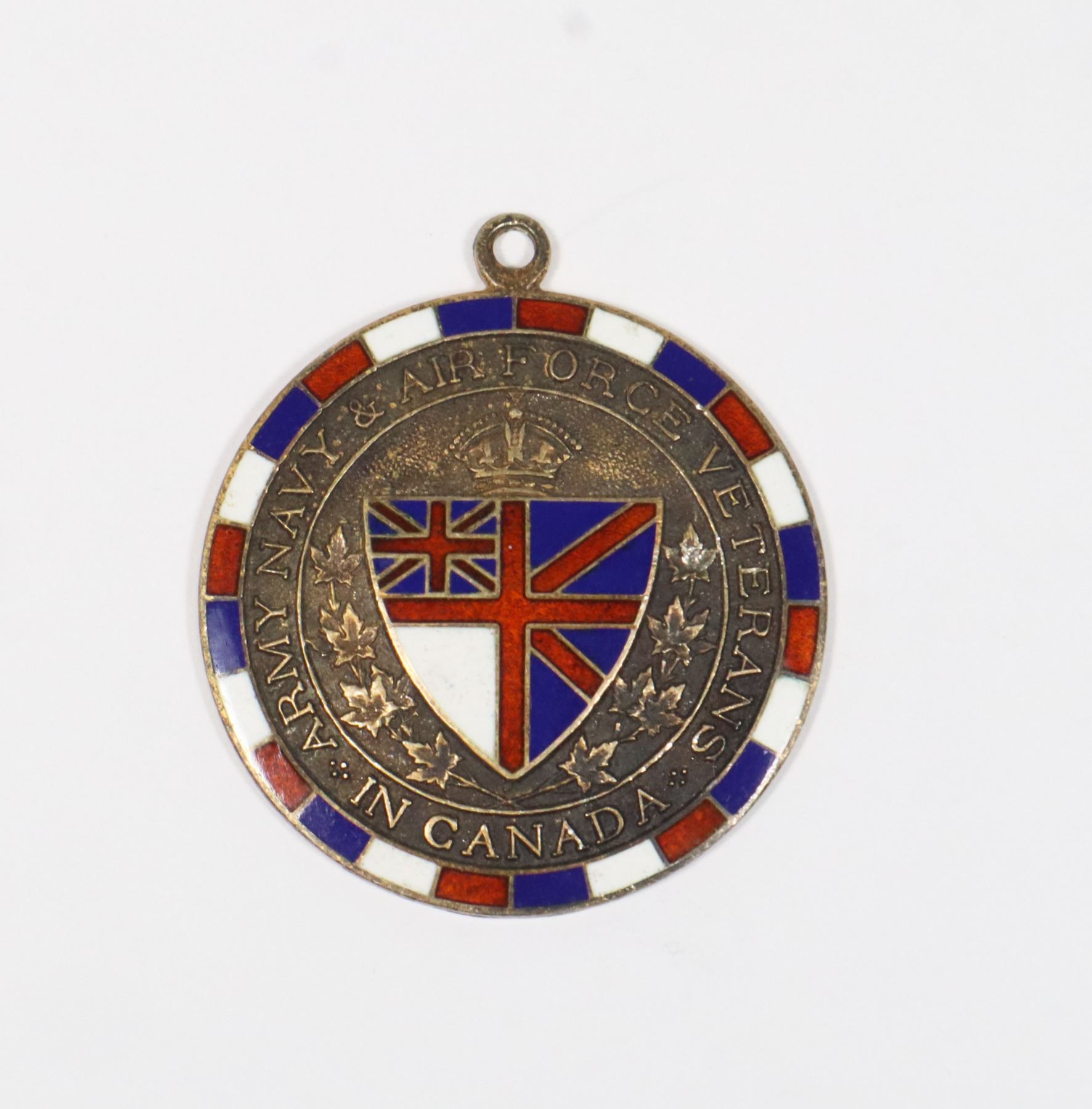 ARMY NAVY AIRFORCE VETERANS IN CANADA MEDAL STERLING SILVER J.R. GAUNT MARKED PRESENTED TO J.H. SANSOME 20/12/54 ROCKWOOD UNIT 303