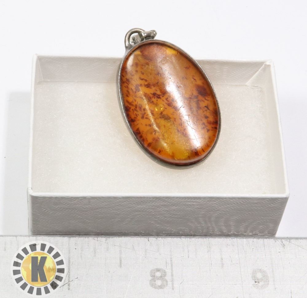 .925 STERLING SILVER AND AMBER PENDANT, 4CM TALL. VINTAGE FROM ESTATE. NICE COLOUR ***ITEM LOCATED IN LETHBRIDGE AB