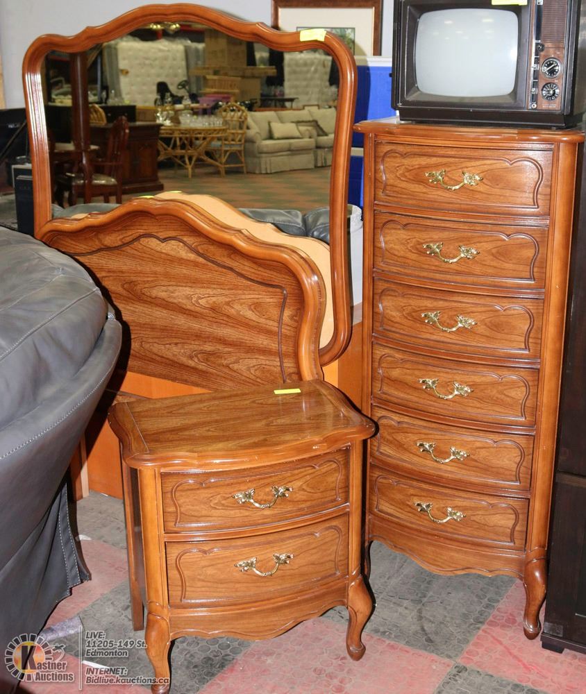 SINGLE HEADBOARD, LINGERIE DRESSER, NIGHT TABLE, AND MIRROR