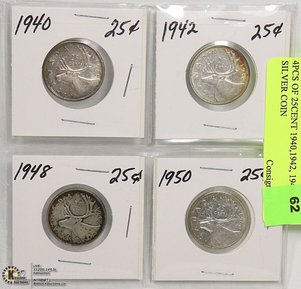 4PCS OF 25CENT 1940,1942, 1948, 1950 SILVER COIN