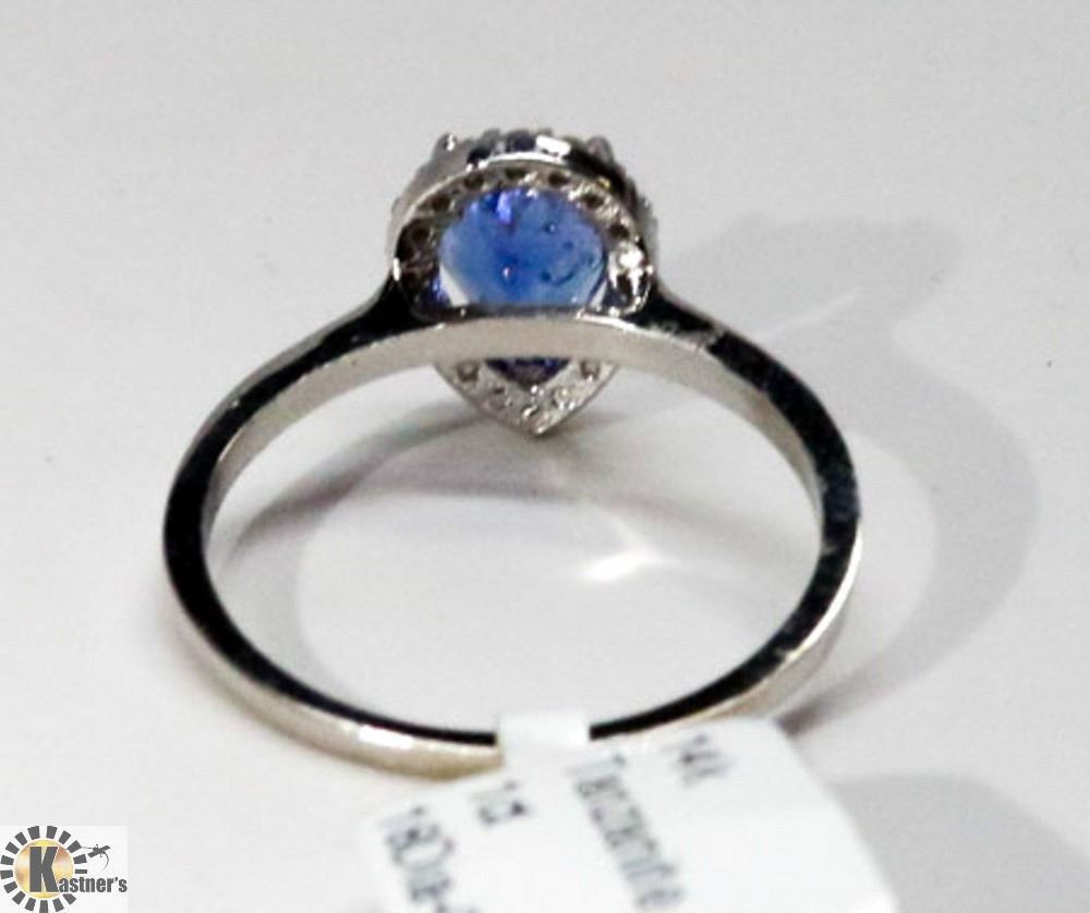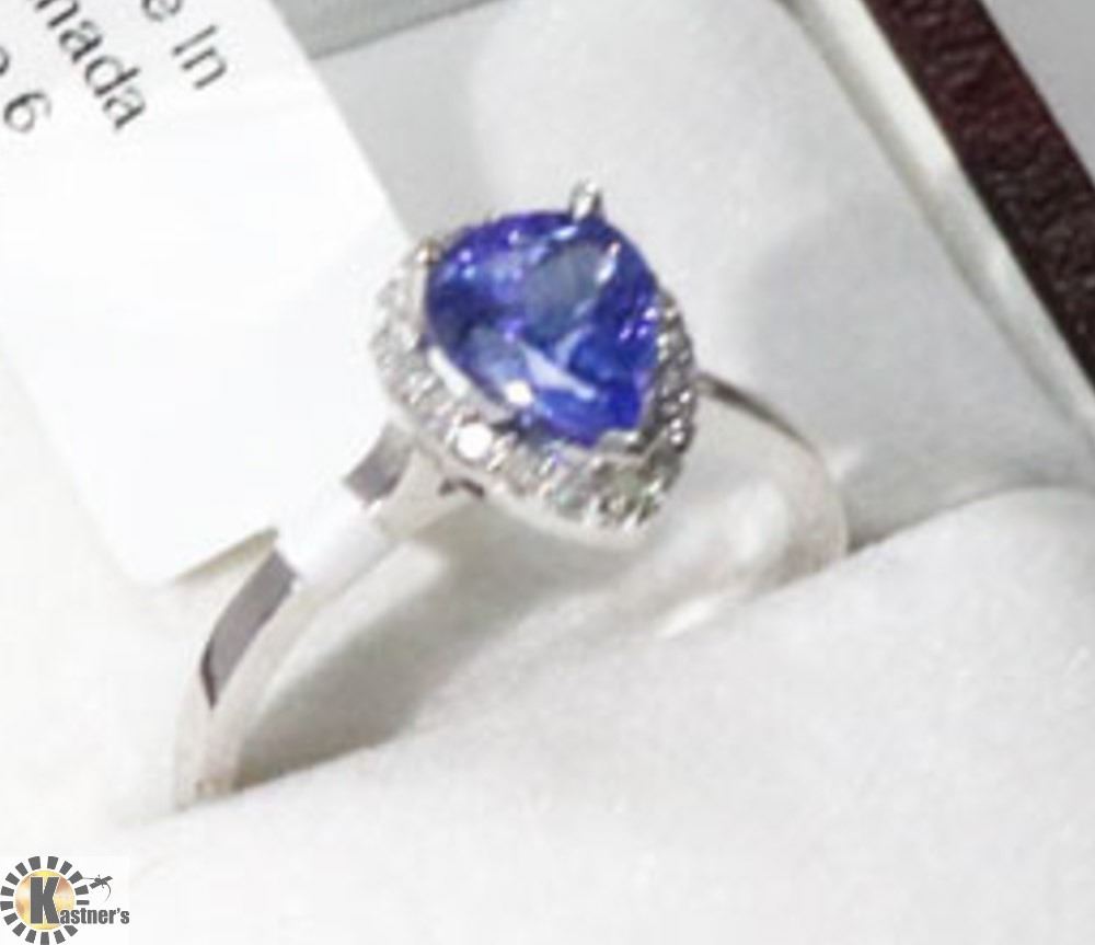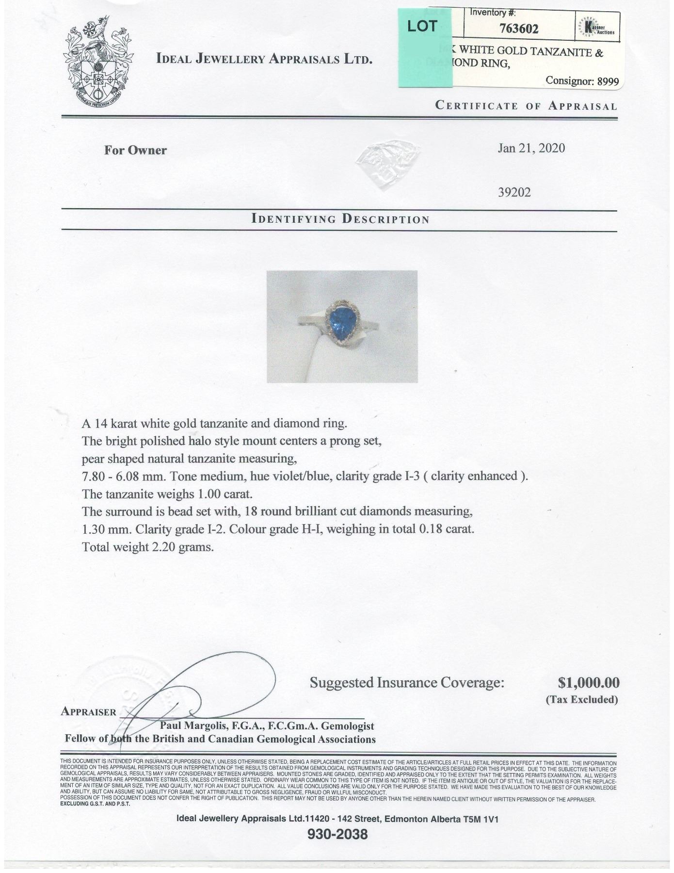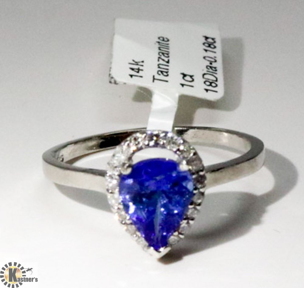 SIZE 7, ONE PEAR SHAPED NATURAL TANZANITE (MEASURING 7.80 - 6.08 MM, TONE MEDIUM, HUE VIOLET/BLUE, CLARITY GRADE I-3 [ENHANCED CLARITY], WEIGHS 1.00 CARATS), 18 ROUND BRILLIANT CUT DIAMONDS (MEASURING 1.30 MM, CLARITY GRADE I-2,COLOR GRADE H-I, WEIGHING TOTAL OF 0.18 CARATS). COMES WITH CERTIFICATE OF APPRAISAL FROM LOCAL APPRAISER, SUGGESTED INSURANCE COVERAGE $1,000.00. JEWELLERY