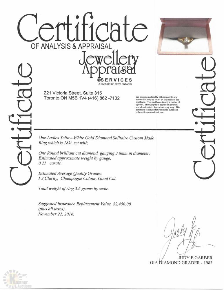 18KT YELLOW-WHITE GOLD DIAMOND(0.21CT)SOLITAIRE CUSTOM MADE RING W/ COA - SIZE 6-SUGGESTED REPLACEMENT VALUE $2,450.00