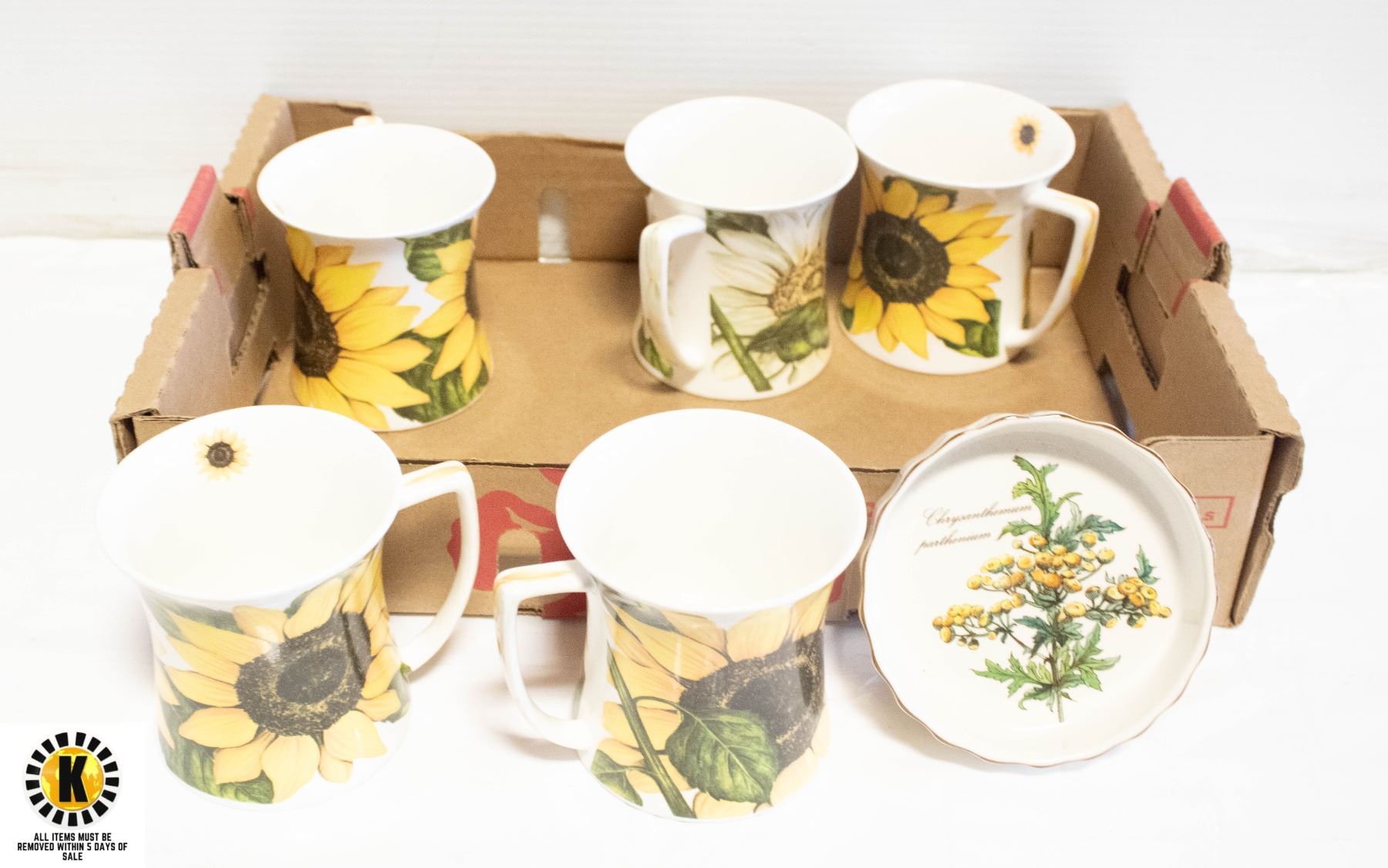 5 BOTANICAL FLOWER MUGS BONECHINA WITH FLOWER DISH