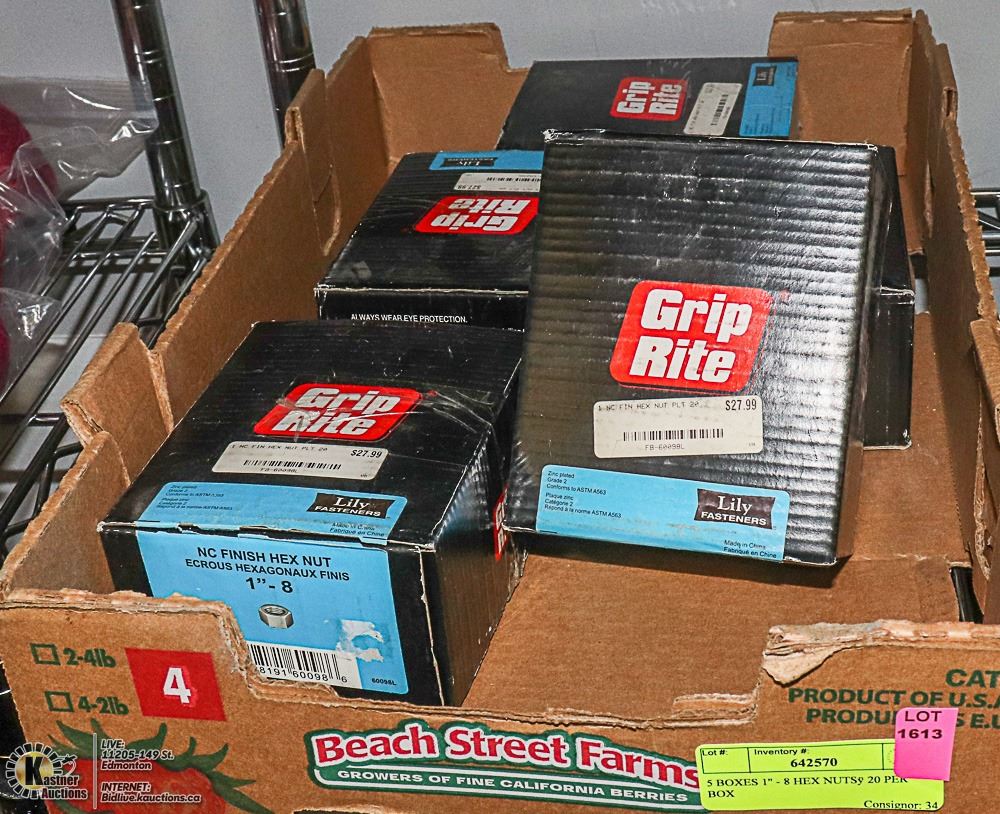5 BOXES 1'' - 8 HEX NUTS 20 PER BOX