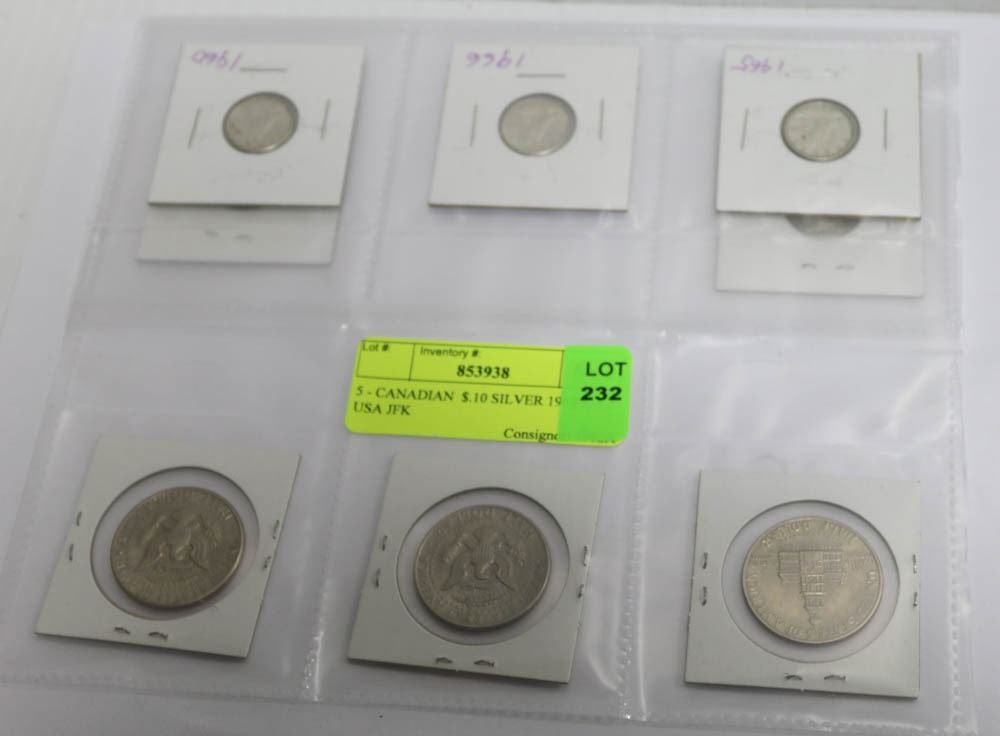 5 - CANADIAN $.10 SILVER 1960'S, + 3 USA JFK