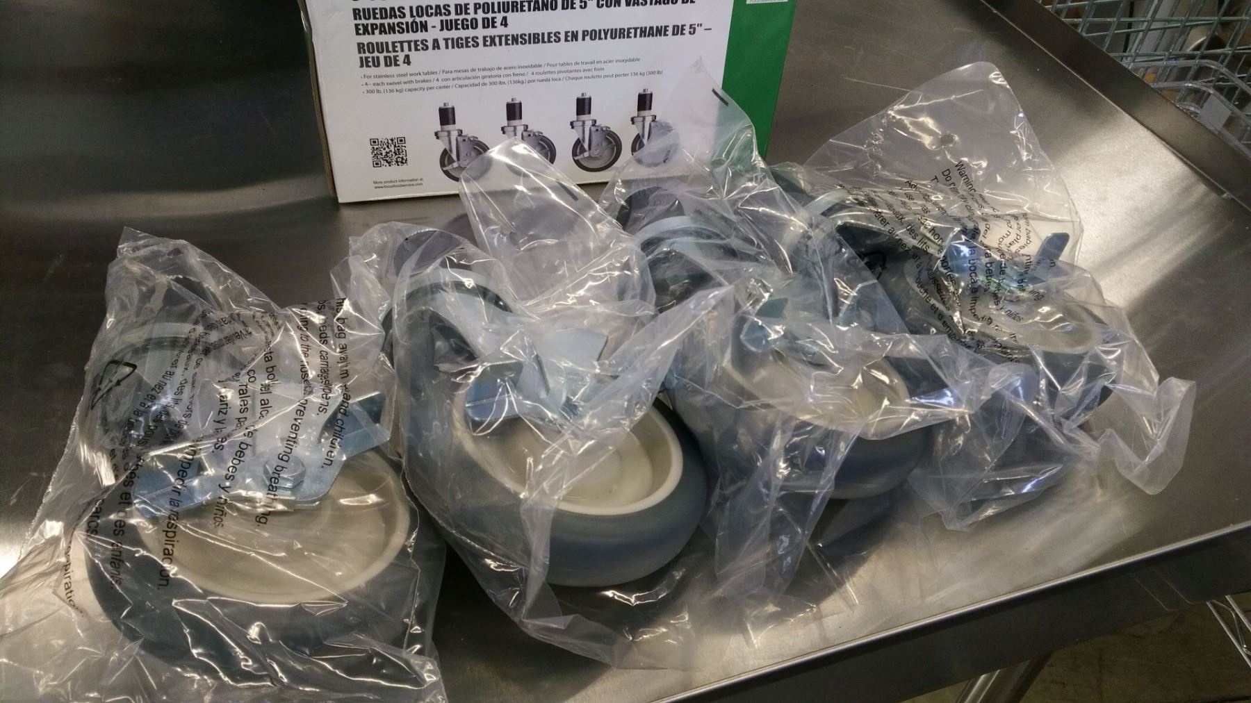 KW691 - NEW 5" CASTERS FOR WORK TABLES AND EQUIPMENT STANDS, EXPANDING STEM SWIVEL W/ BRAKE, FOCUS FECST5 - LOT OF 4