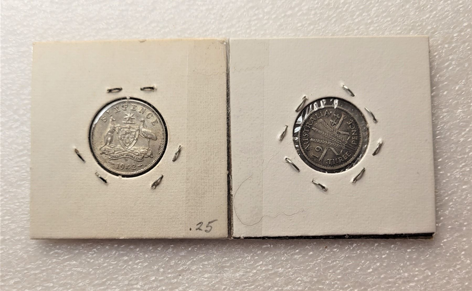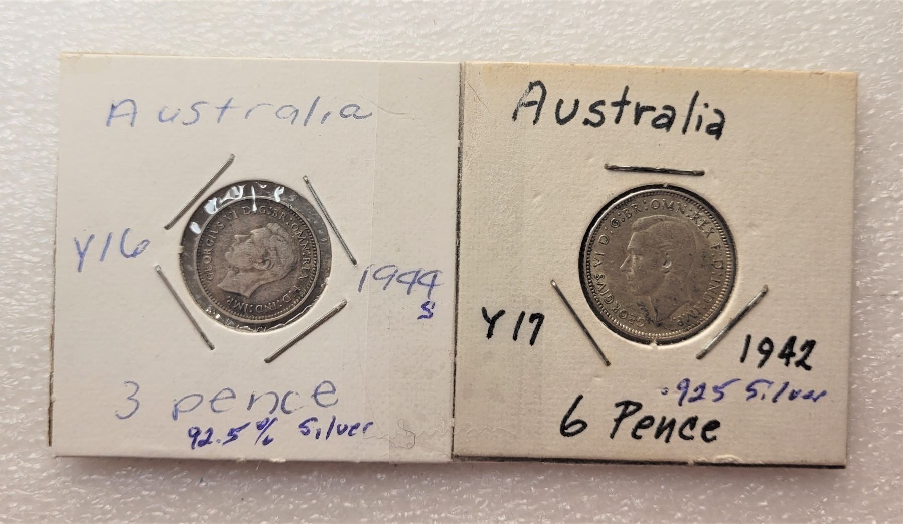 5) LOT OF 2 AUSTRALIAN COINS, 3 PENCE DATED 1944 AND 6 PENCE DATED 1942, 925 SILVER CONTENT. CURRE