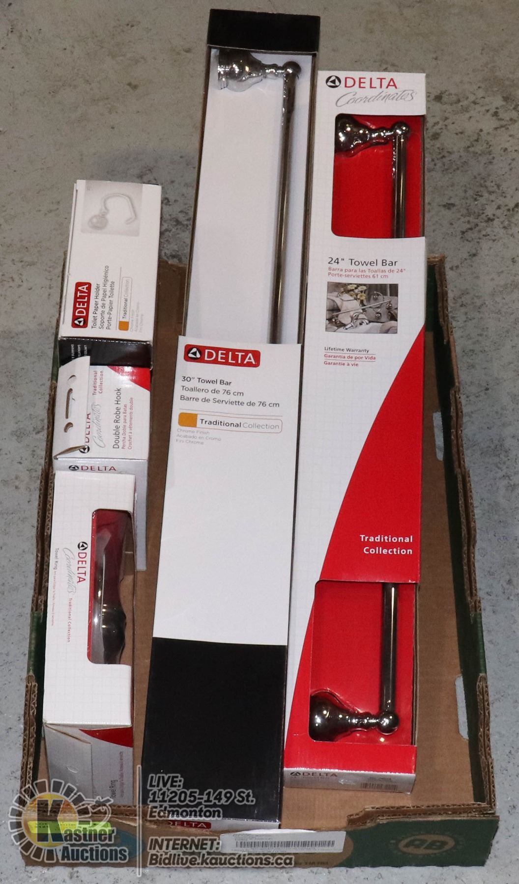 30" TOWEL BAR, 24" TOWEL BAR, ROBE HOOK, TP HOLDER, TOWEL RING