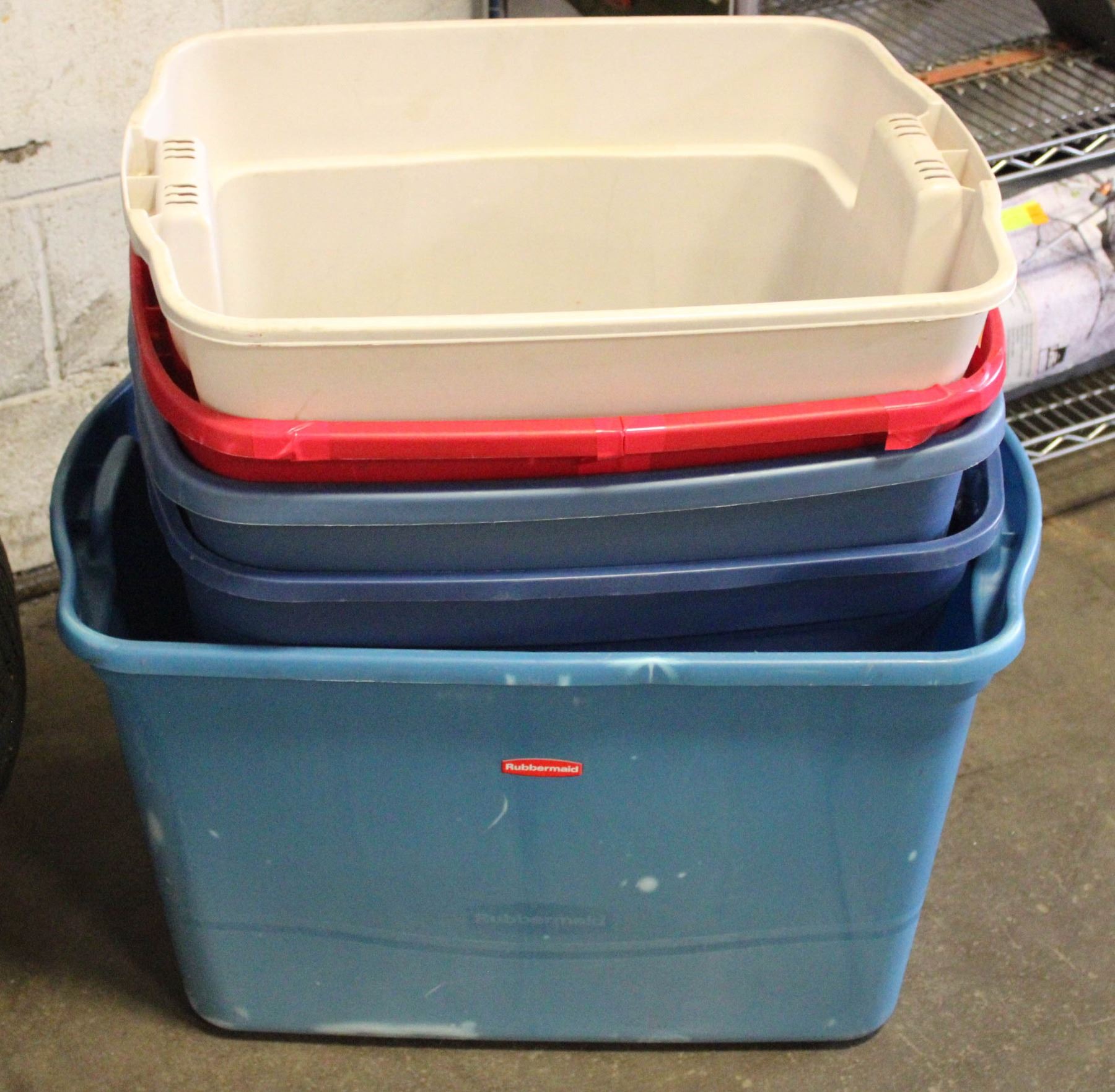 5 RUBBERMAID TOTES 4 72L TOTES + 84L TOTE NO LIDS