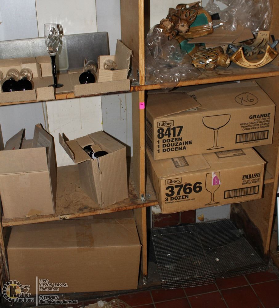 5 SHELVES OF ASSORTED NEW BAR GLASSWARE AND MORE