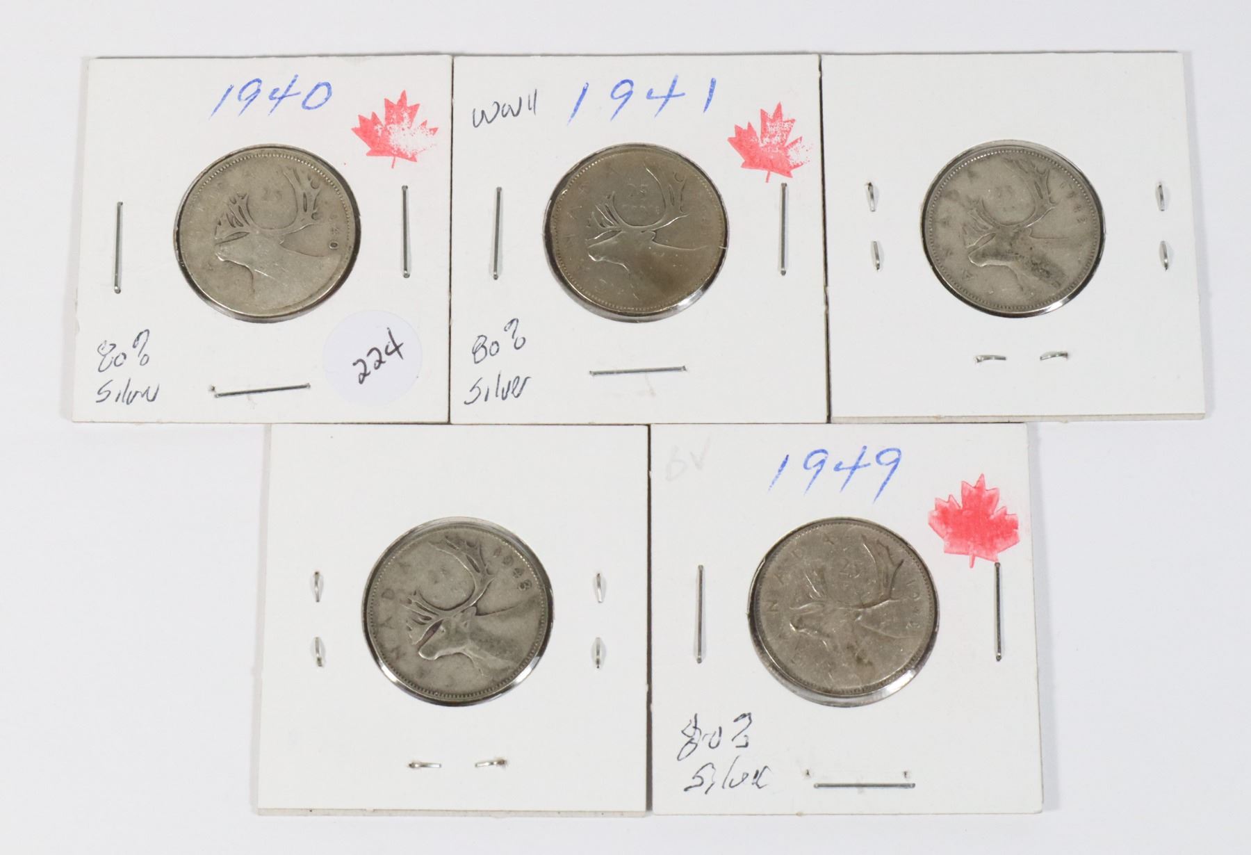 5 SILVER QUARTERS 1940, 1941, 1942, 1943 & 1949