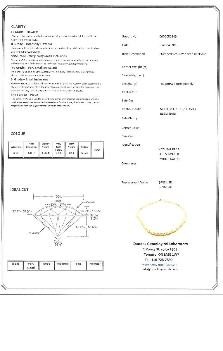 STERLING SILVER CLASP FRESHWATER PEARL NECKLACE. W/ COA- SUGGESTED REPLACEMENT VALUE $598.00