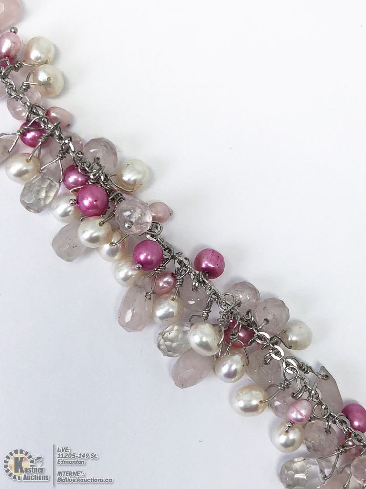 55-LS112 - STERLING SILVER BROCHET FRESH WATER PEARL & GEMSTONES (25.30GRMS) BRACELET. JEWELLERY