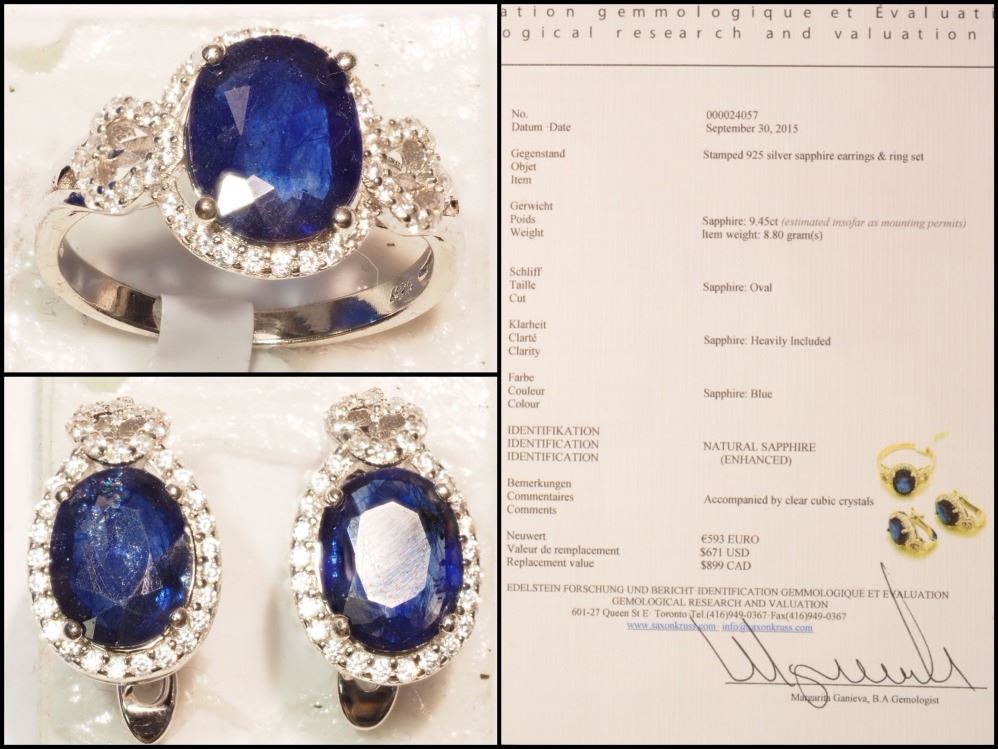 COA. STERLING SILVER EARRING AND RING SET WITH BLUE SAPPHIRE (9.45CT) CENTER STONES IN A HALO OF WHITE CUBIC ZIRCONIA SUGGESTED REPLACEMENT VALUE $899.00