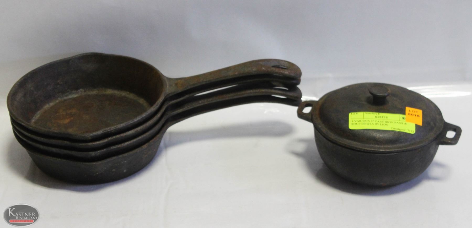 5 VARIOUS 6" CAST IRON PANS & SOUP BOWLS W/ LIDS