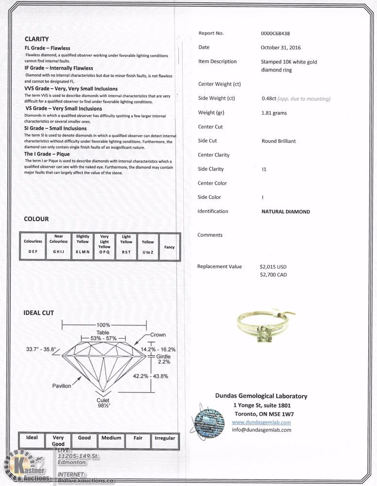 50 - GS11; 10KT WHITE GOLD DIAMOND (0.48CT) RING W/ COA - SUGGESTED REPLACEMENT VALUE $2,700.00 SIZE 6.5