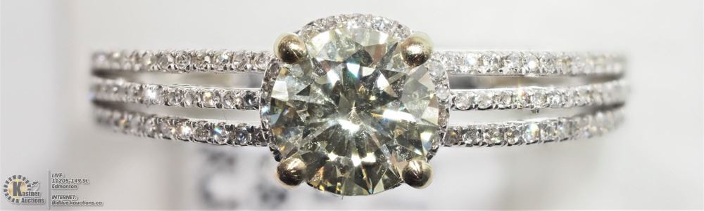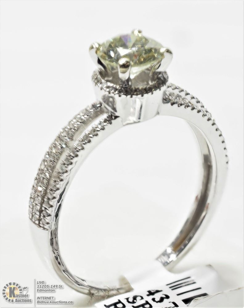 50-NT115- 14K WHITE GOLD DIAMOND (0.87CT) WITH DIAMOND HALO (0.17CT) RING SIZE 7 WITH VIDEO BOX & COA. SUGGESTED REPLACEMENT VALUE $16000.00. JEWELLERY.