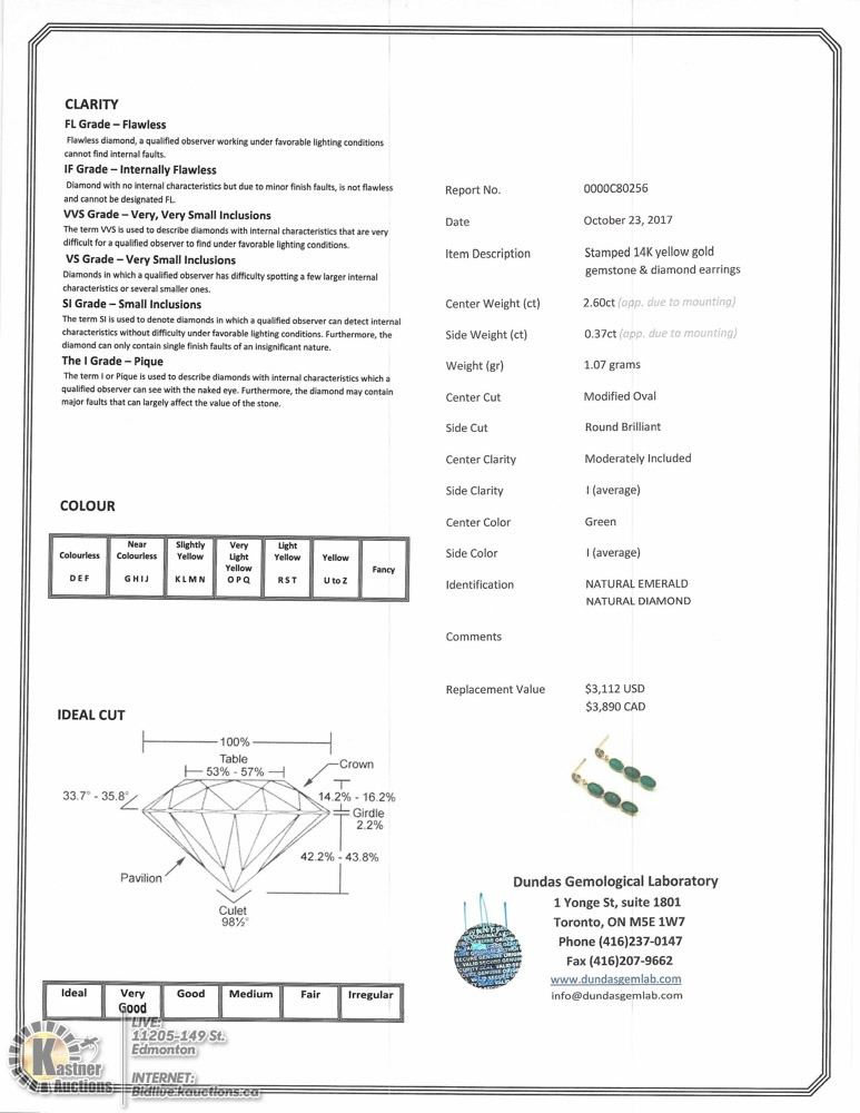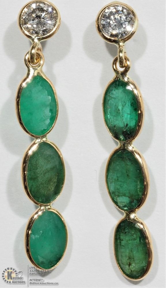 50 - MM86 - 14K YELLOW GOLD EMERALD (2.60CT) AND DIAMOND (0.37CT) DROP EARRINGS W/COA. SUGGESTED VALUE $3890.00. JEWELLERY
