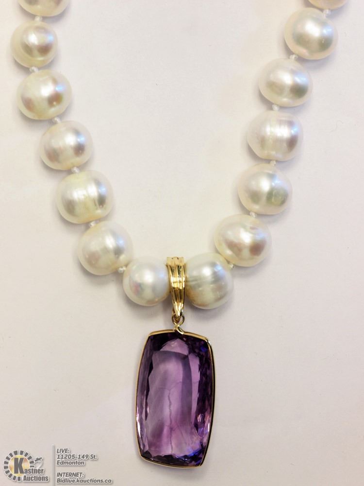 14KT YELLOW GOLD LARGE AMETHYST (75.40CT) CLIP-ON PENDANT & PEARL NECKLACE WITH STERLING SILVER CLASP. W/ COA - SUGGESTED REPLACEMENT VALUE $5,886.00