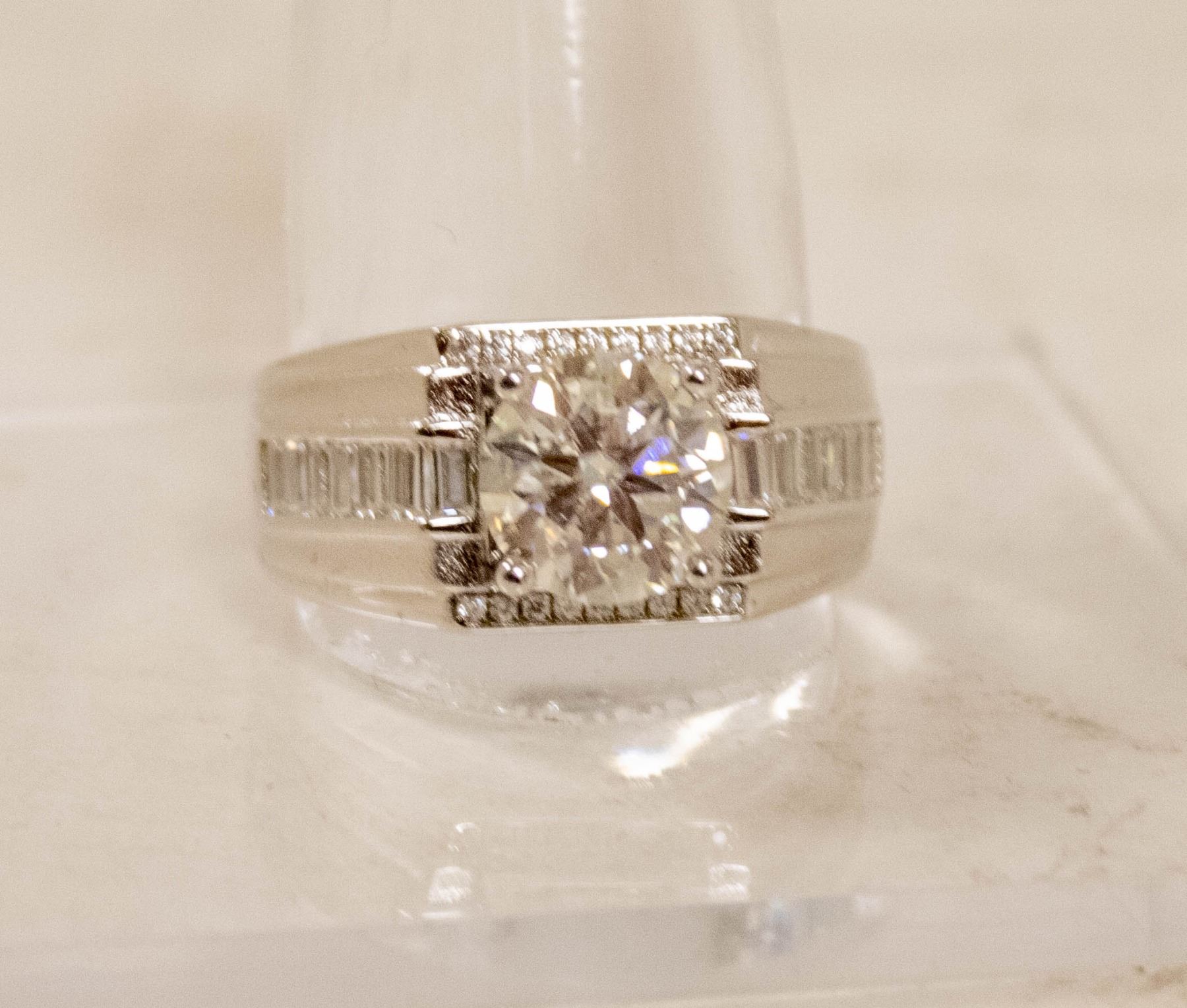 MOISSANITE STONE VVS D COLOR SET IN CENTER OF MENS RING IN 925 SILVER RING SIZE 10.5 RETAIL VALUE $1,475.00 **ALL ITEMS MUST BE REMOVED BY 5PM SATURDAY, JUNE 15TH 2024. ALL REMAINING ITEMS WILL BE SUBJECT TO A $6.00 PER DAY STORAGE CHARGE. ANY ITEMS REMAINING AFTER MONDAY, JULY 1ST 2024 WILL BE CONSIDERED FORFEITED. NO REFUNDS WILL BE ISSUED FOR FORFEITED ITEMS. TO SCHEDULE A PICK UP APPOINTMENT CLICK HERE