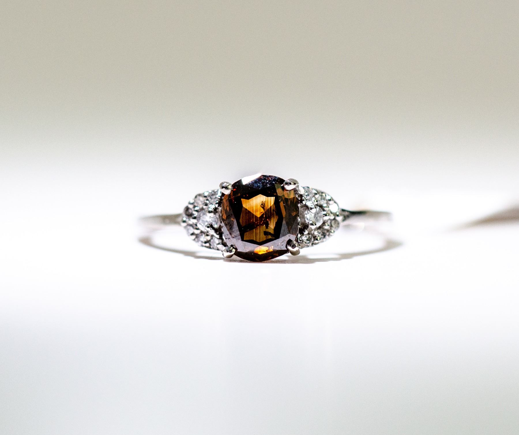 SIZE 6.5 A PLATINUM FANCY COLOURED BROWN DIAMOND RING. THE BRIGHT POLISHED MOUNT WITH DIAMOND SET SHOULDERS CENTERS FOUR PRONG SET, CUSHION CUT, FANCY COLOURED BROWN DIAMONDMEASURING, 6.37- 5.64 X 3.30 MM. HUE DARK YELLOWISH/BROWN. CLARITY GRADE 1-2. CARAT WEIGHT 1.10 CARATS.THE SHOULDERS OF THE MOUNT ARE SET WITH, 14 ROUND BRILLIANT CUT DIAMONDS MEASURING, 1.00 - 1.50 MM. CLARITY GRADE I 1-2. COLOUR GRADE H-1, WEIGHING IN TOTAL 0.10 CARAT.TOTAL WEIGHT 3.00 GRAMS. CERTIFICATE OF APPRAISAL FROM LOCAL APPRAISER, SUGGESTED INSURANCE COVERAGE $3000.00.