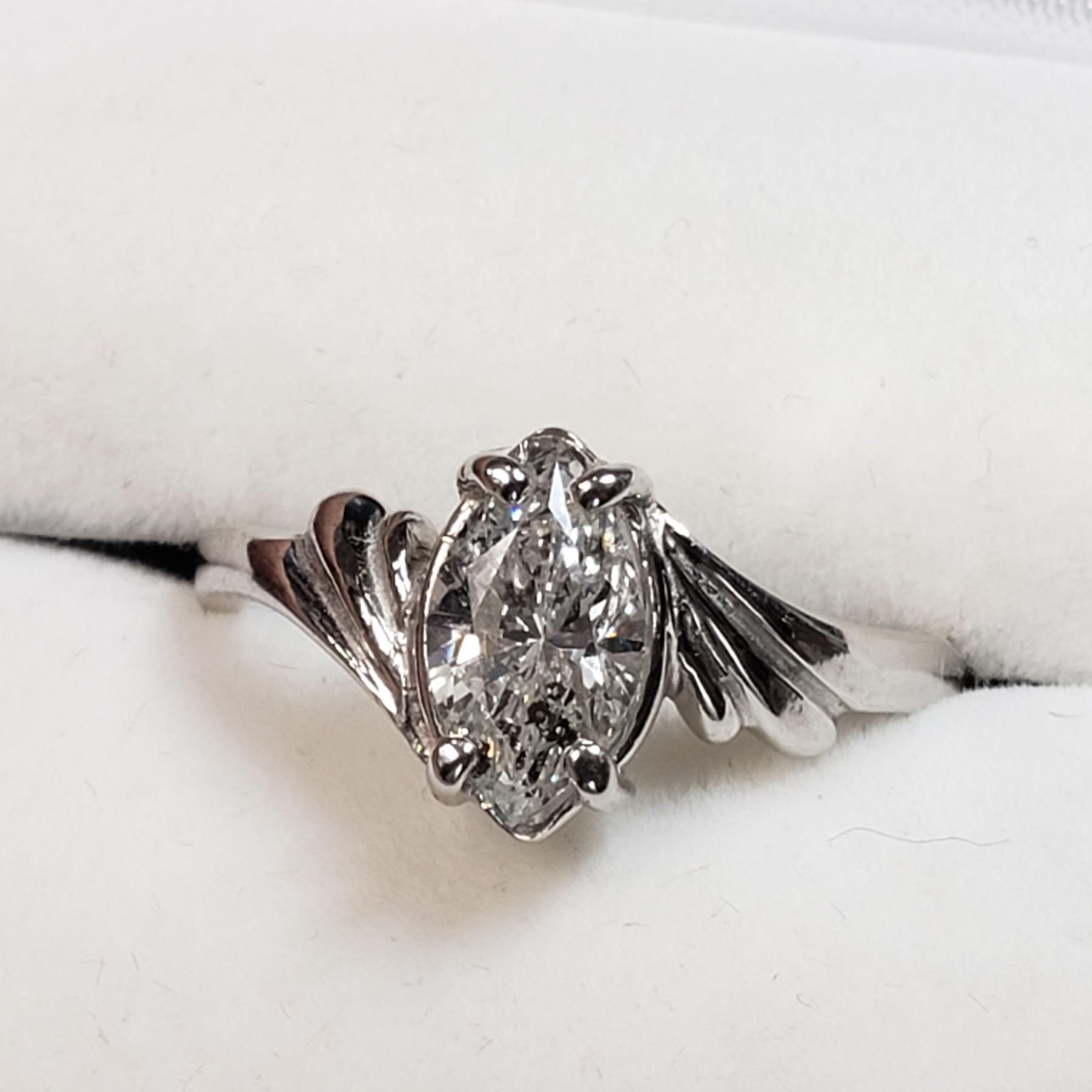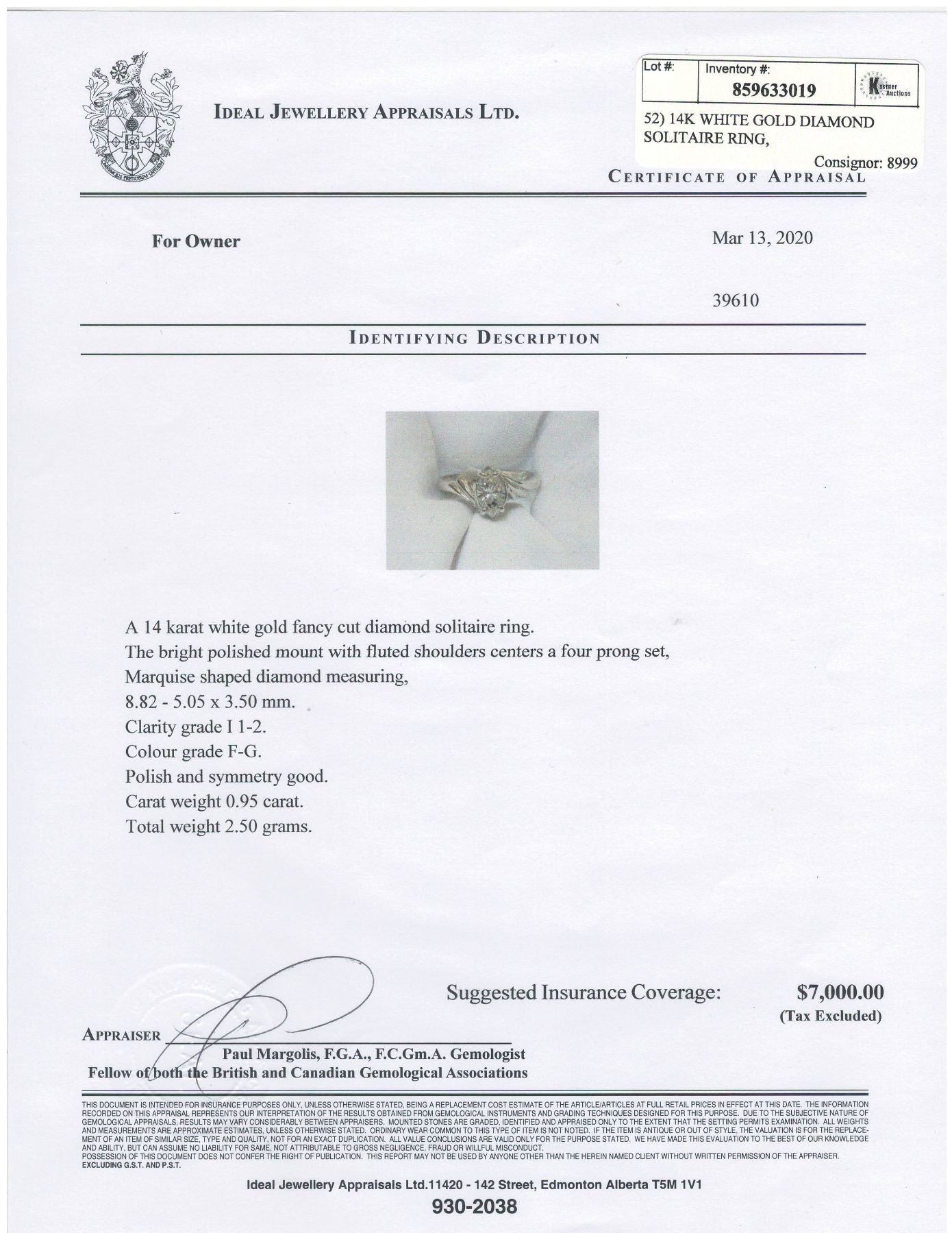 SIZE 6.75, ONE MARQUISE SHAPED DIAMOND (MEASURING 8.82-5.05 X 3.50MM, CLARITY GRADE I 1-2, COLOR GRADE F-G, POLISH AND SYMMETRY GOOD, WEIGHING 0.95 CARATS). COMES WITH CERTIFICATE OF APPRAISAL FROM LOCAL APPRAISER. SUGGESTED INSURANCE COVERAGE$7,000.00. JEWELLERY