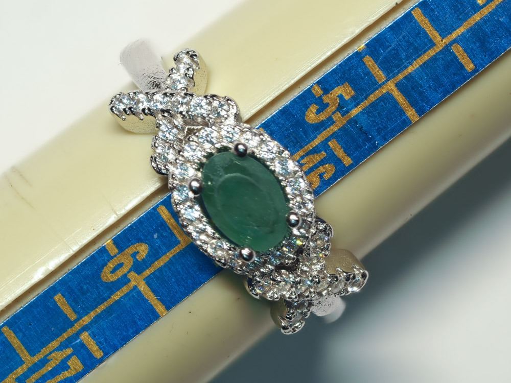 54 - JM37 - STERLING SILVER EMERALD & CZ RING (SIZE 5.75). JEWELRY
