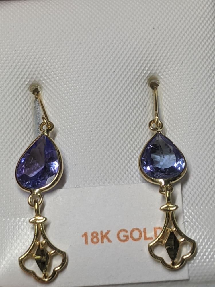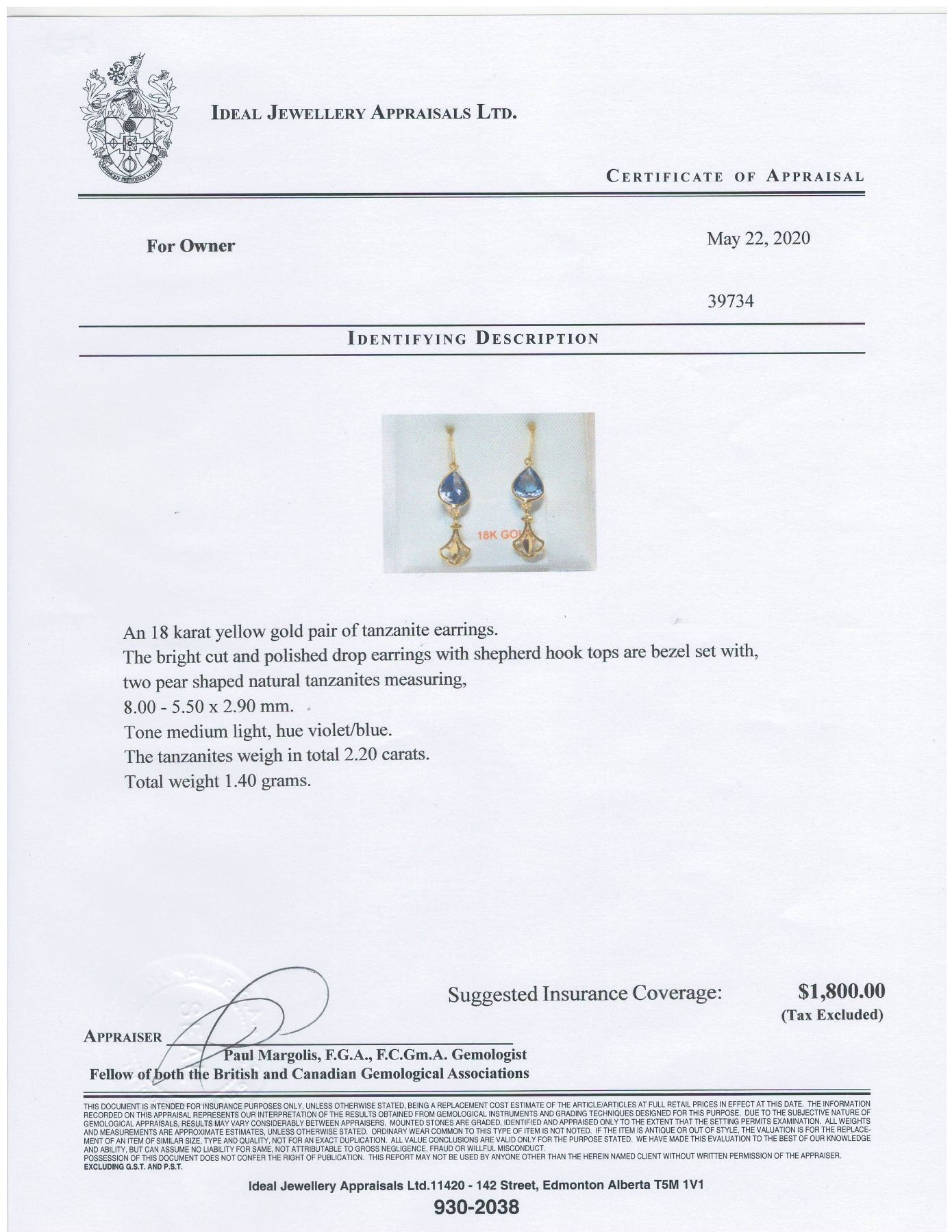 EARRINGS, TWO PEAR SHAPED NATURAL TANZANITES ( MEASURING 8.00 - 5.50 X 2.90MM, TONE MEDIUM LIGHT, HUE VIOLET / BLUE, WEIGHT 2.20 CARATS ). COMES WITH CERTIFICATE OF APPRAISAL FROM LOCAL APPRAISER. SUGGESTED INSURANCE COVERAGE $3,000.00. JEWELLERY