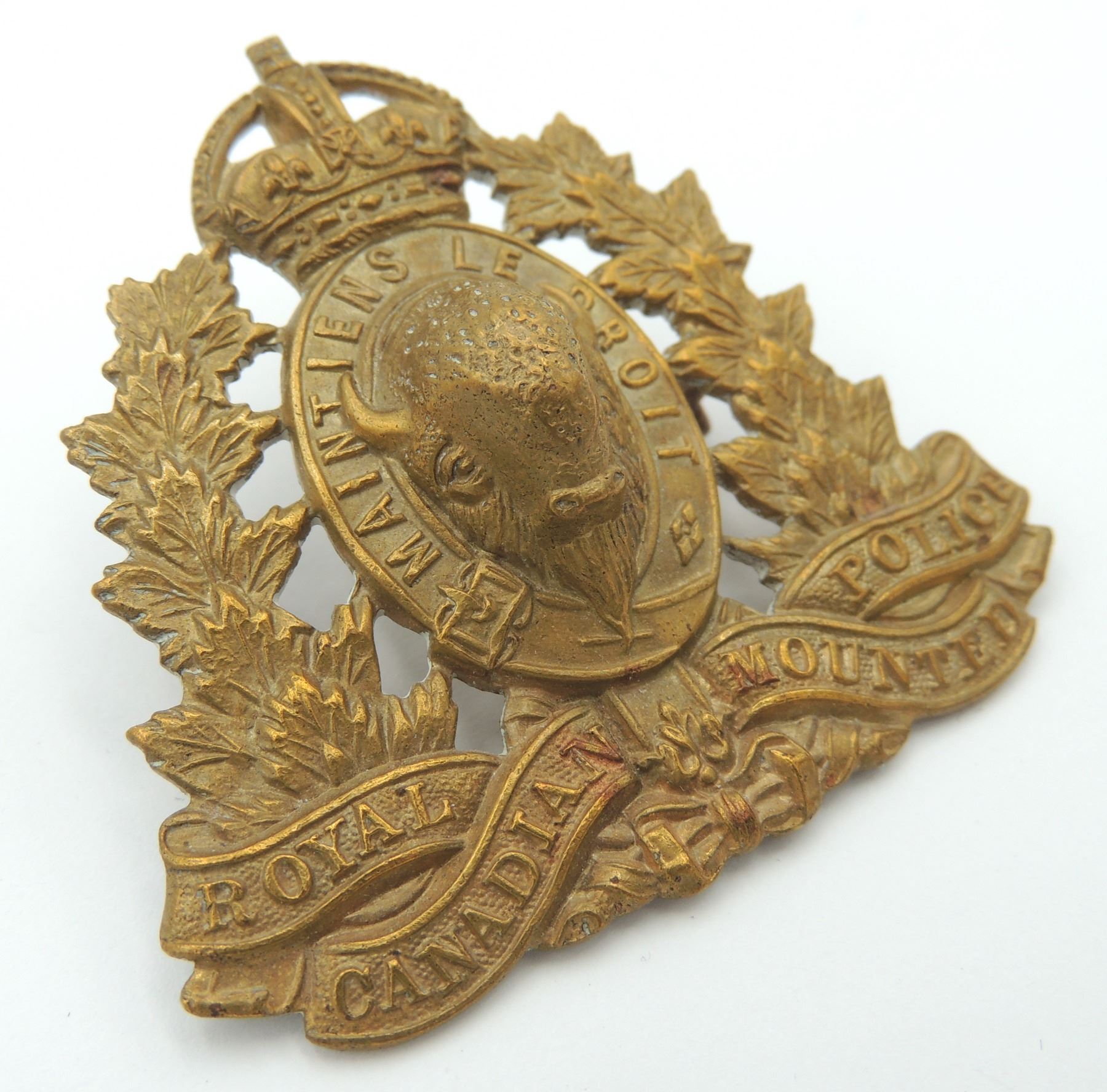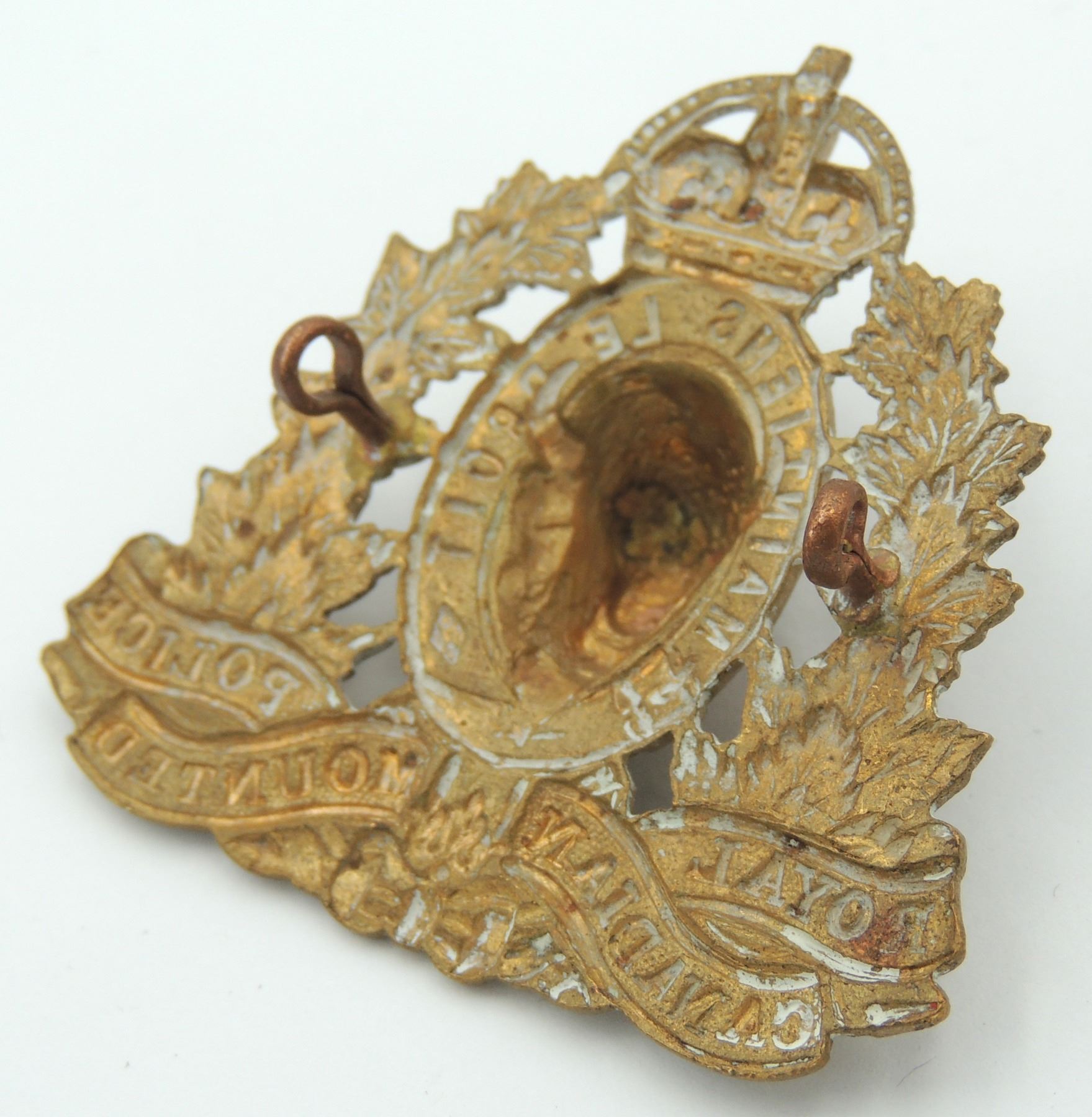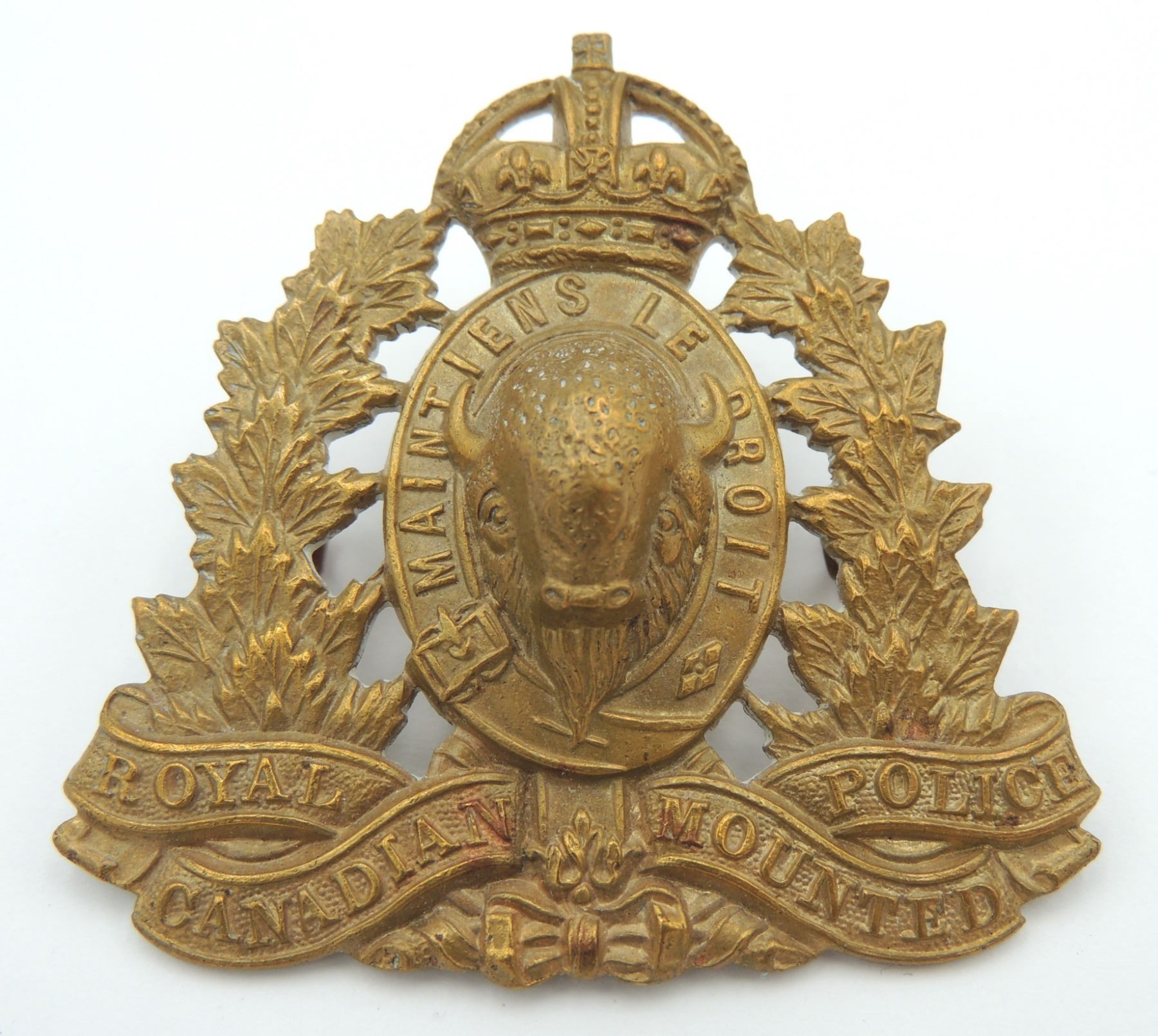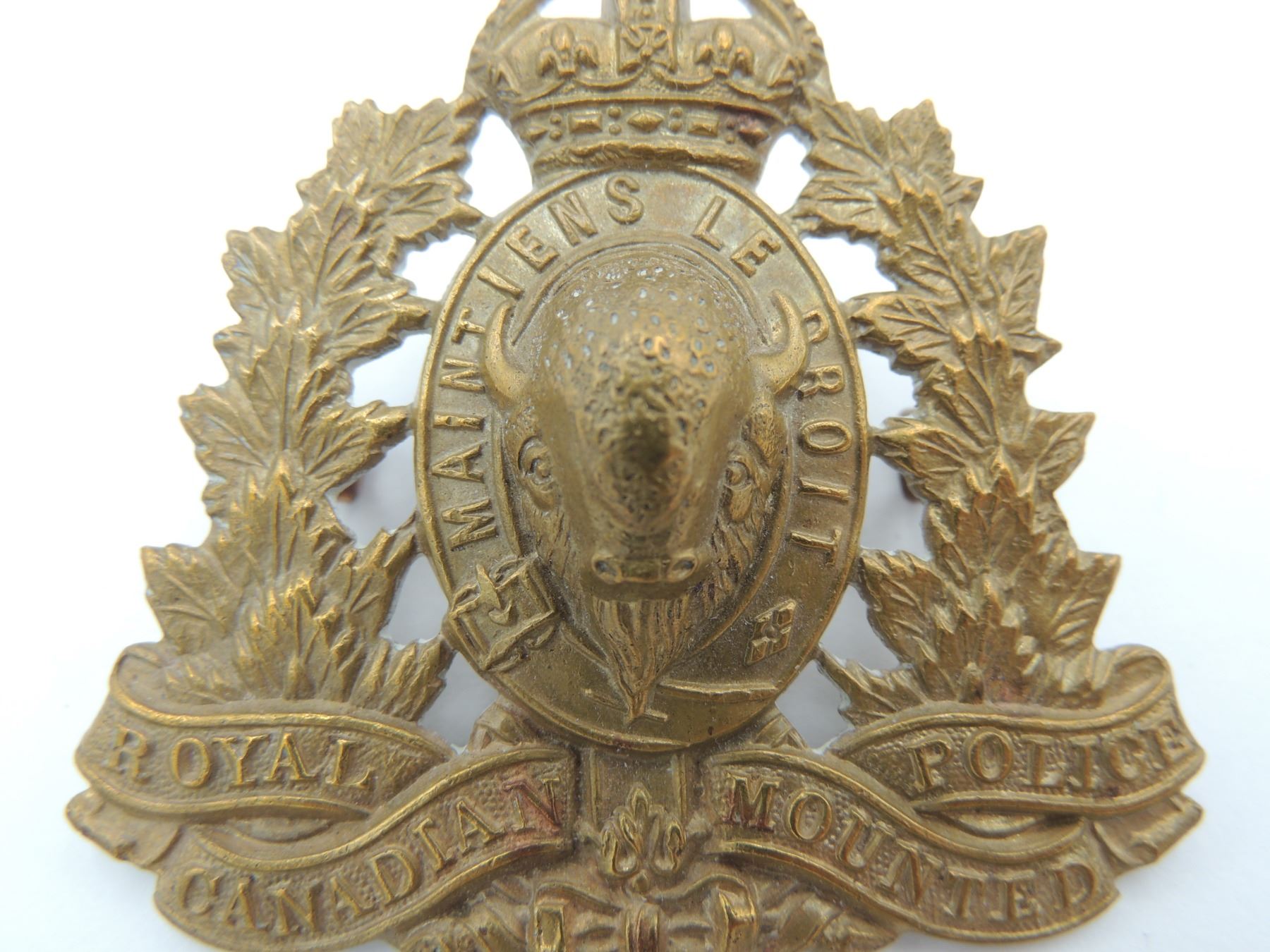 Kings Crown Royal Canadian Mounted Police RCMP Cap Badge, 1940's era- complete with original lugs and unmarked on reverse. Good detailing on front of Badge. Vintage Canadian Canada Law Enforcement Insignia