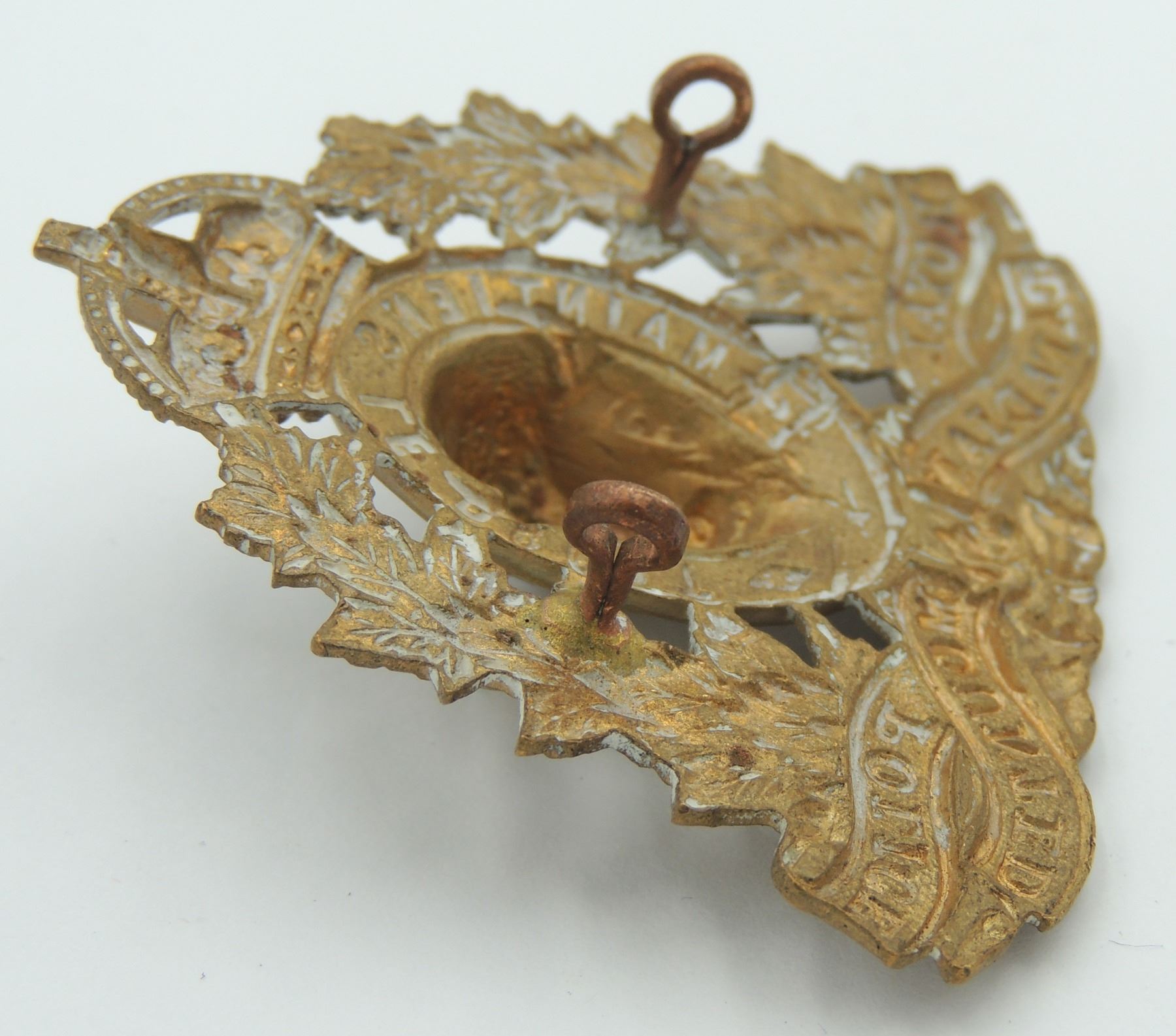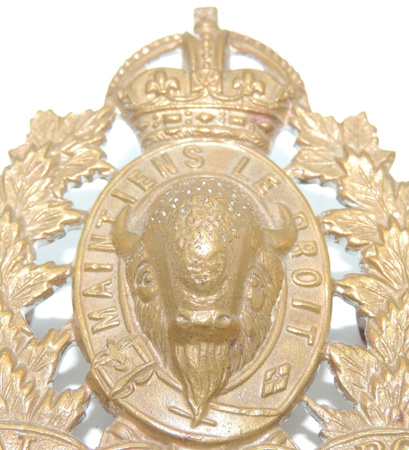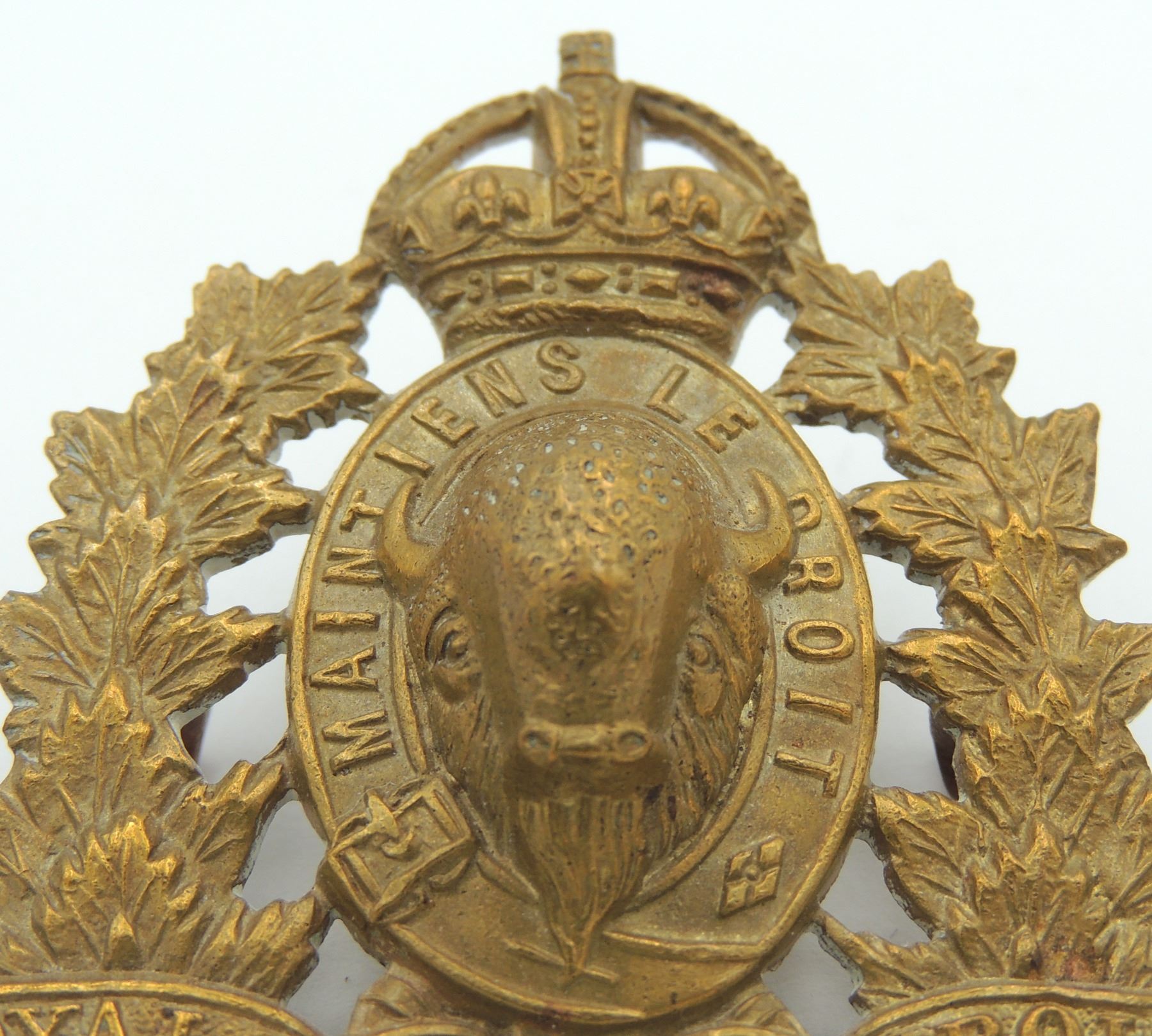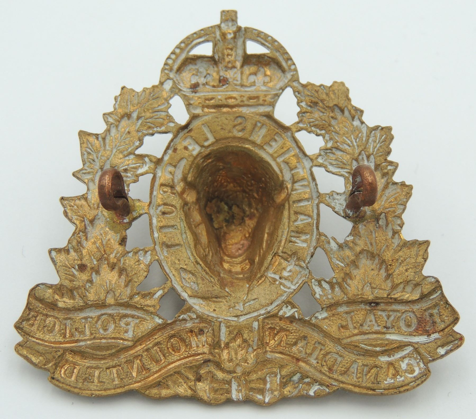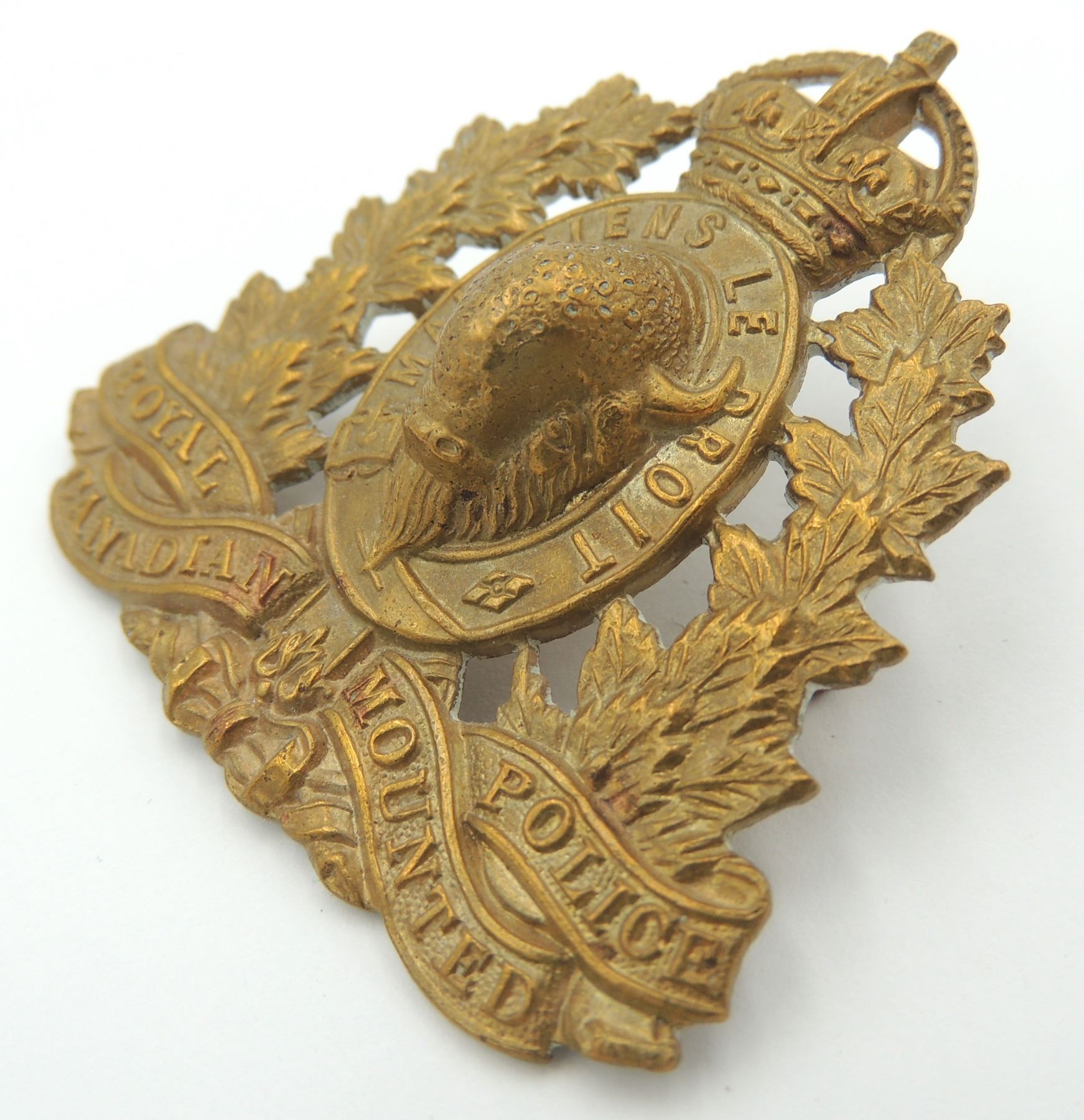Kings Crown Royal Canadian Mounted Police RCMP Cap Badge, 1940's era- complete with original lugs and unmarked on reverse. Good detailing on front of Badge. Vintage Canadian Canada Law Enforcement Insignia