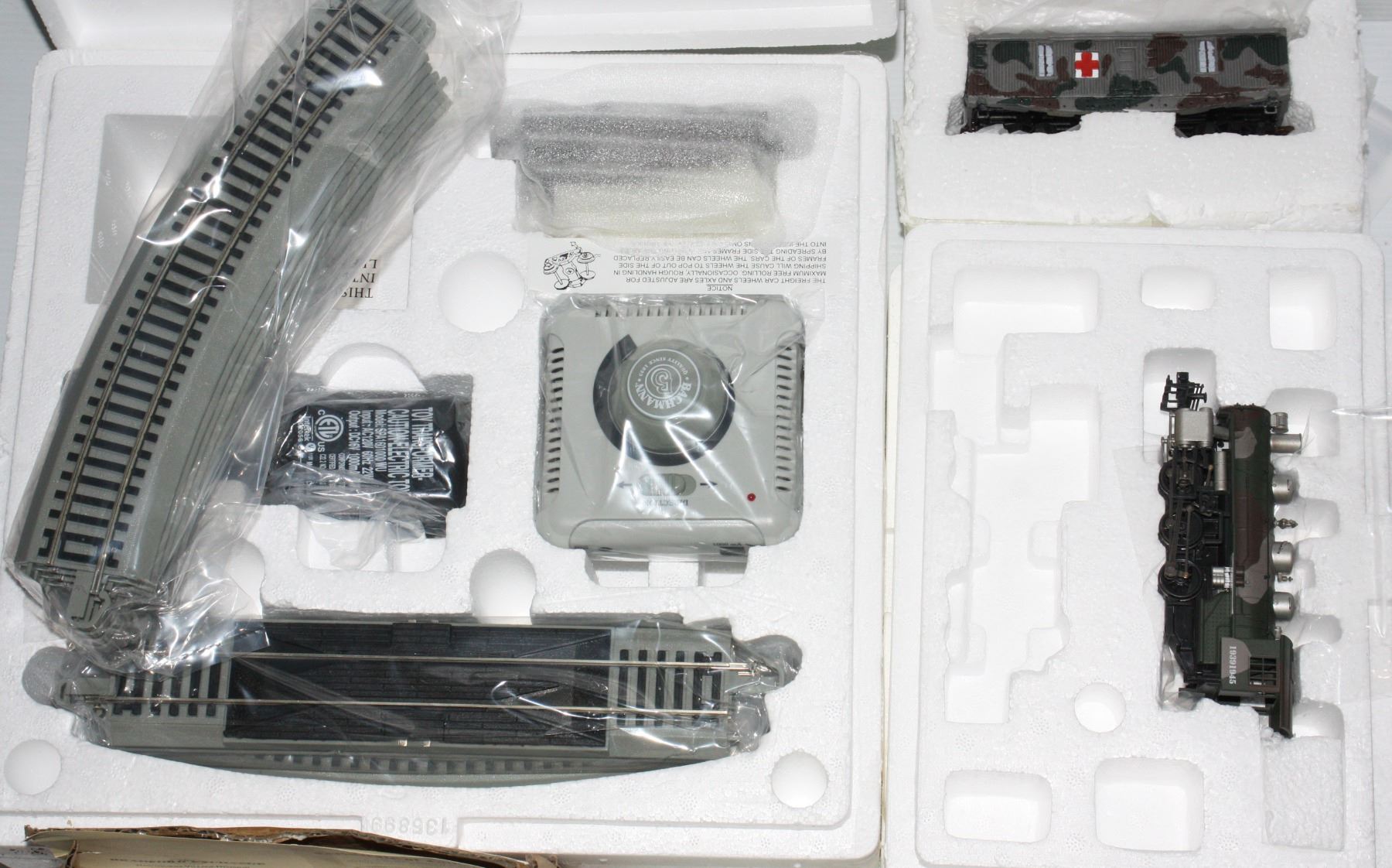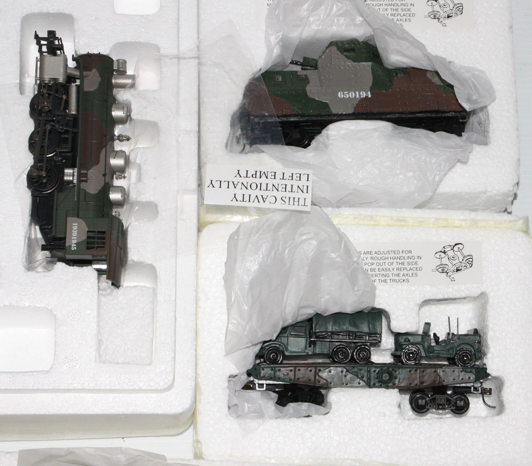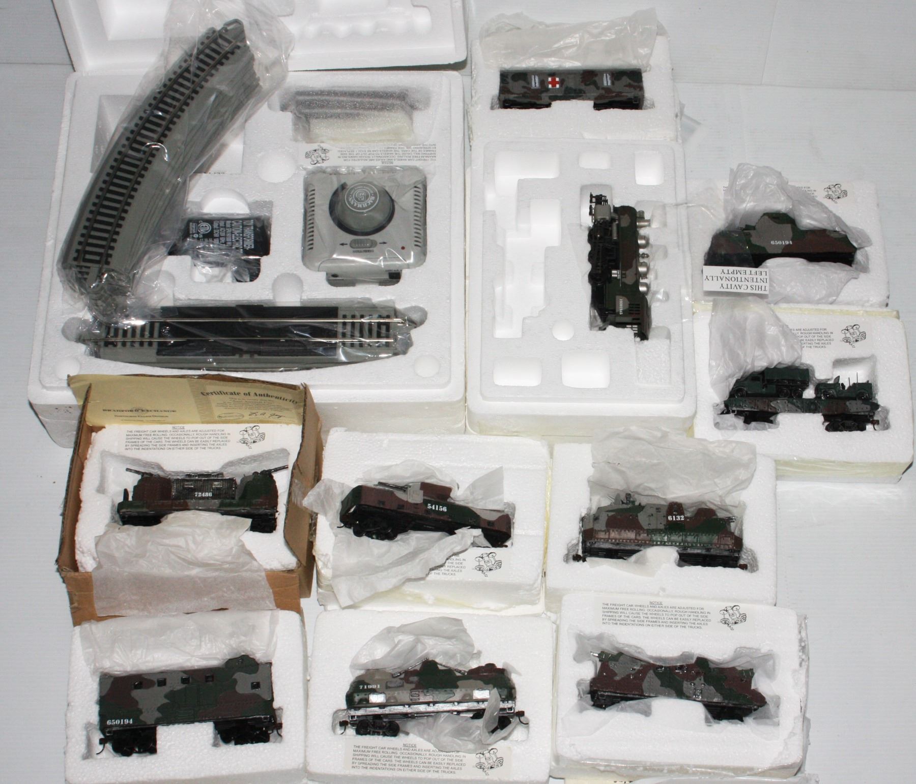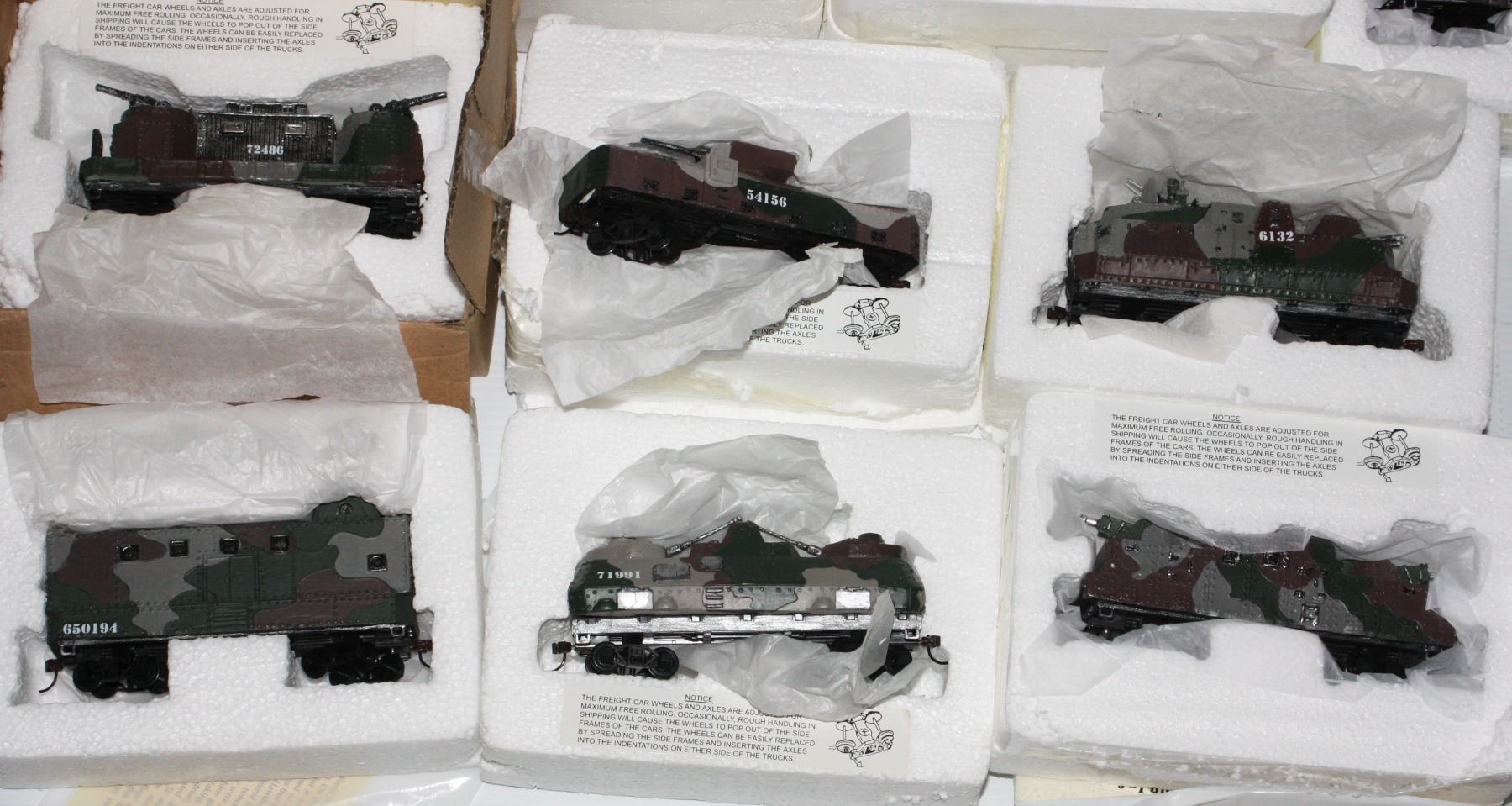 Lot of 11 Military Trains from WWII Armoured Train Collection including Armoured Steam Locomotive, Armoured Tender, Armoured Gun Car, Anti Tank Car, Artillery Trapezoid Wagon, Rail Cruiser, Medical, Artillery/Anti-Aircraft Car, Anti- Aircraft Car, Vehicle Transport etc in Hawthorne Village Military Armoured Hawthorne Village with Foam cover and Certificate- NOS NEW OLD STOCK