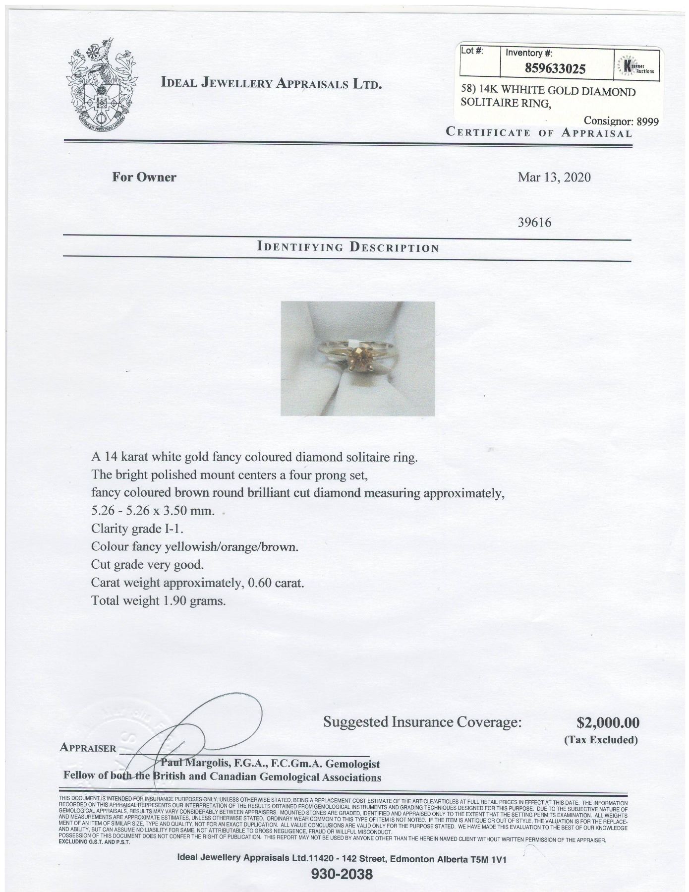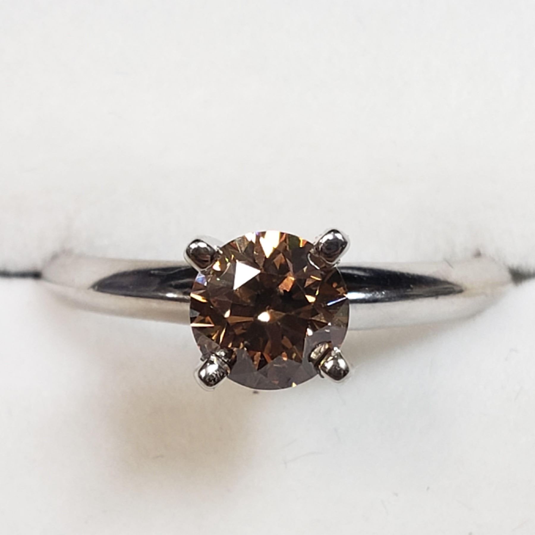 SIZE 4.75, ONE ROUND BRILLIANT CUT DIAMOND (MEASURING 5.26-5.26X3.50MM, CLARITY GRADE I-1, COLOR FANCY YELLOWISH/ORANGE/BROWN, CUT GRADE VERY GOOD, WEIGHING 0.60 CARATS). COMES WITH CERTIFICATE OF APPRAISAL FROM LOCAL APPRAISER.SUGGESTED INSURANCE COVERAGE $2,000.00. JEWELLERY