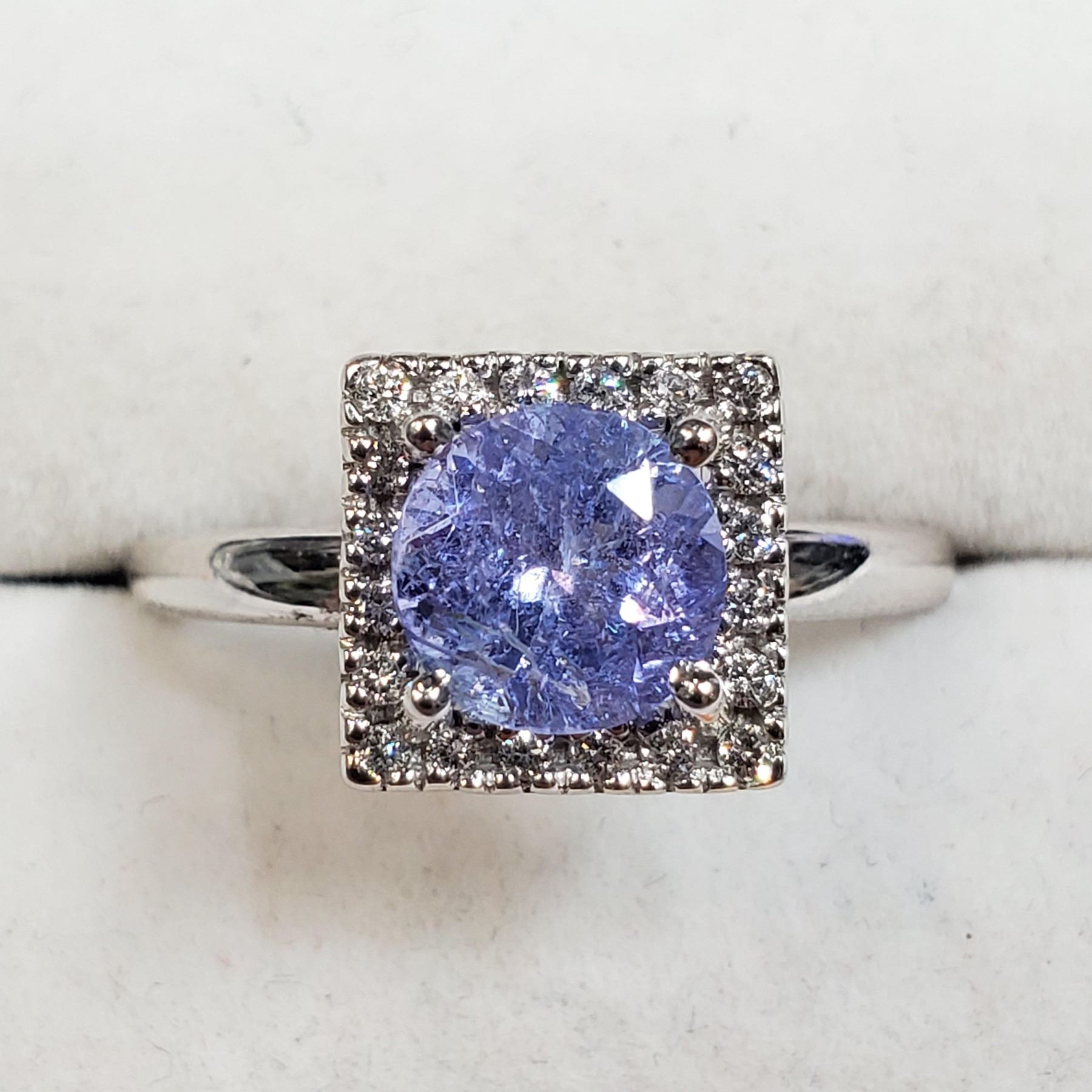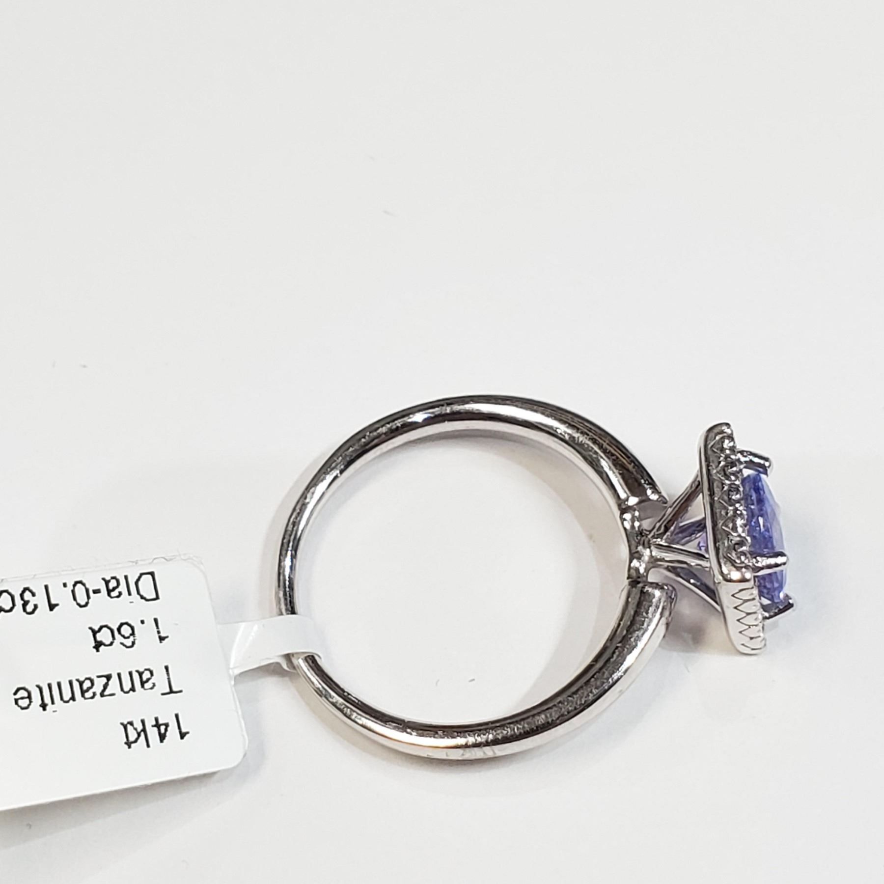 SIZE 6.75, ONE ROUND CUT NATURAL TANZANITE (MEASURING 7.13 - 7.18 X 4.70 MM, TONE LIGHT, HUE BLUEISH/VIOLET, VIOLET DOMINANT, CUT GRADE GOOD, CLARITY GRADE I-3 [CLARITY ENHANCED] WEIGHING 1.60 CARATS), 20 ROUND BRILLIANT CUT DIAMONDS (MEASURING 1.10 - 1.20 MM, CLARITY GRADE SI-2, COLOR GRADE H-I, WEIGHIN 0.13 CARATS). COMES WITH CERTIFICATE OF APPRAISAL FROM LOCAL APPRAISER. SUGGESTED INSURANCE COVERAGE $1,200.00. JEWELLERY.