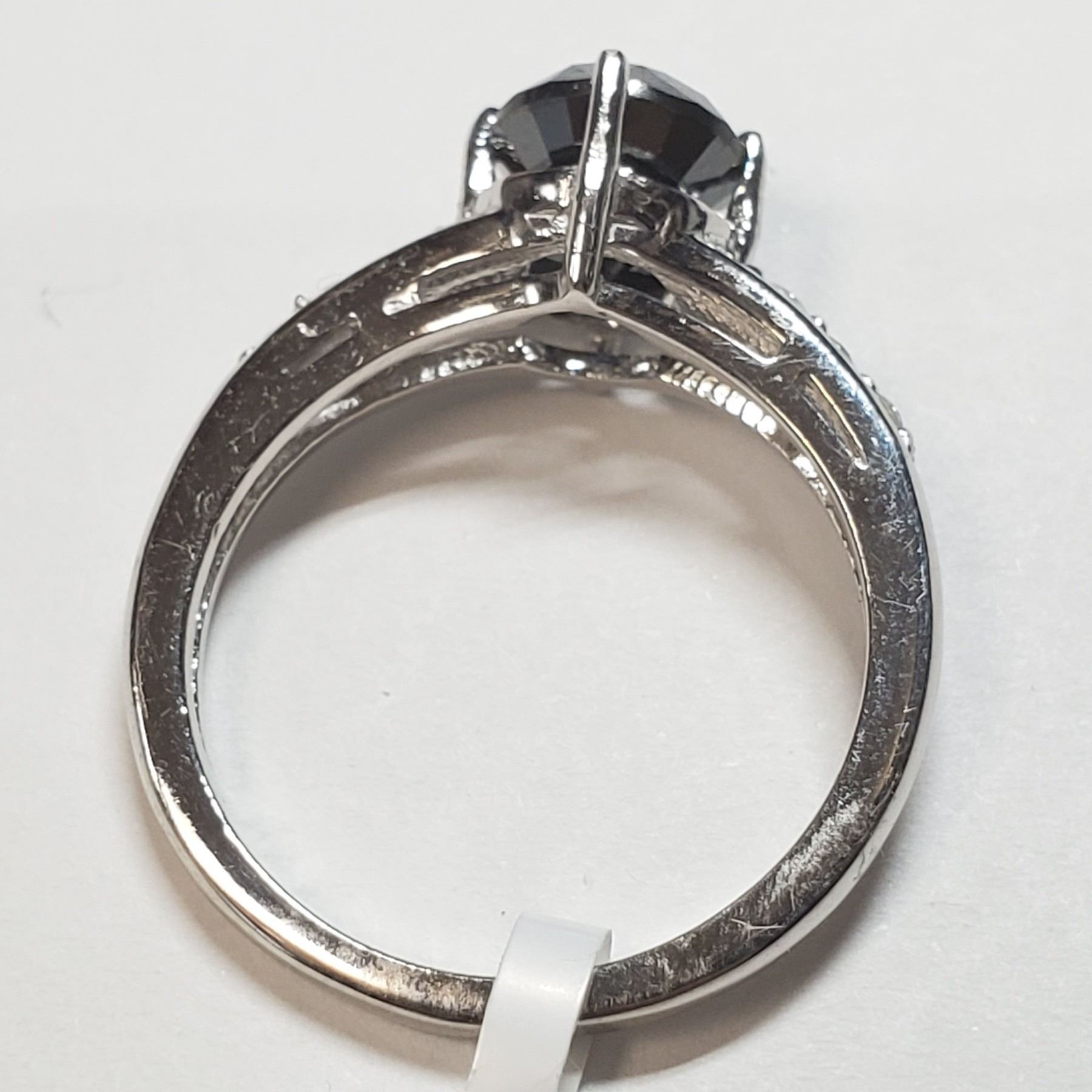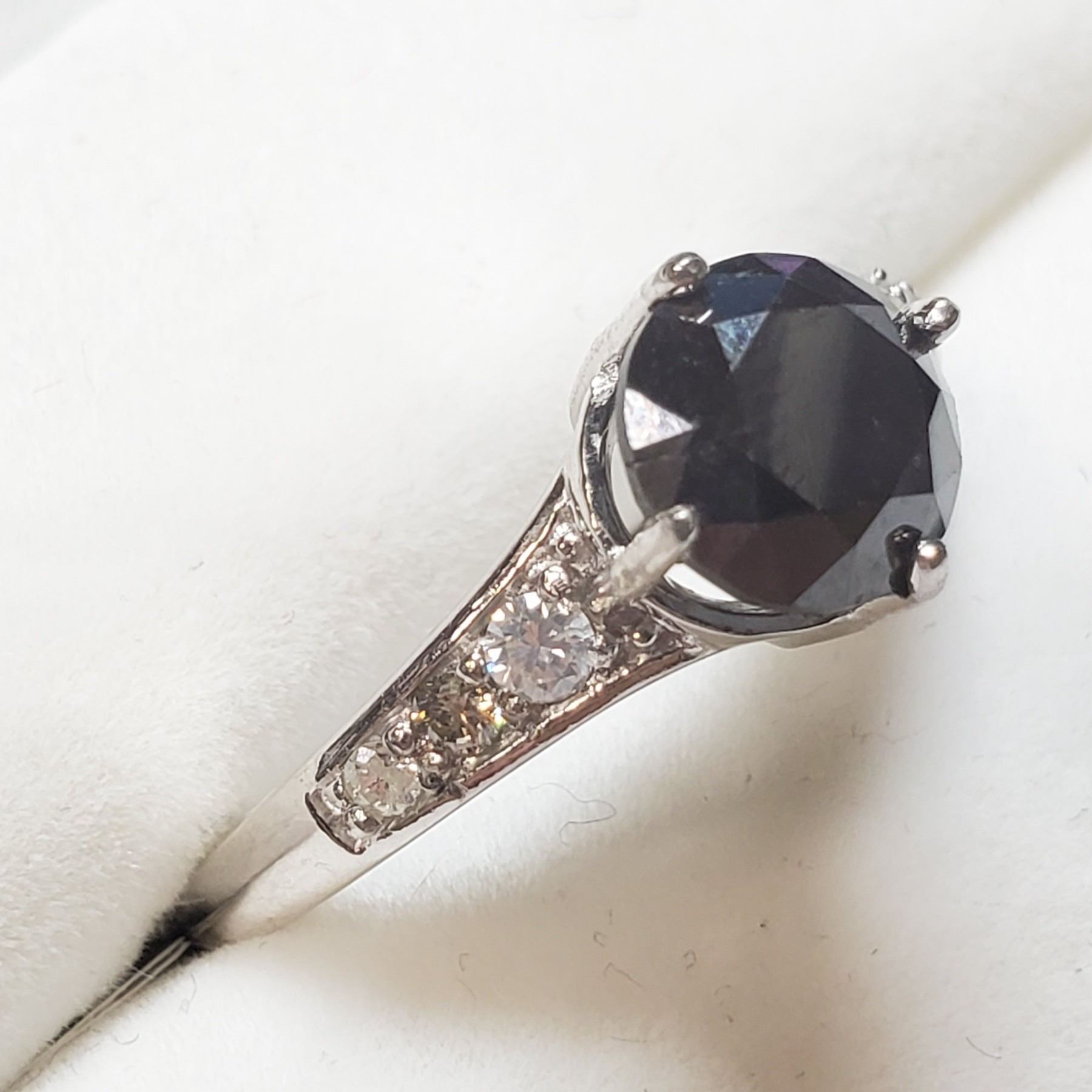 6) 14 KARAT WHITE GOLD BLACK DIAMOND RING, SIZE 7