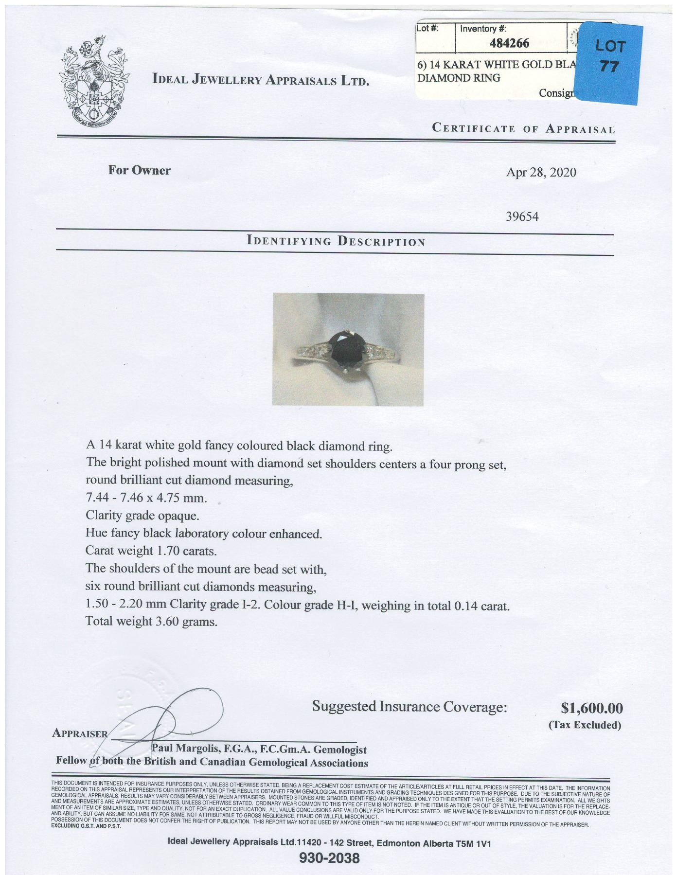 ROUND BRILLIANT CUT DIAMOND (MEASURING 7.44 - 7.46 X 4.75MM, CLARITY GRADE OPAQUE, HUE FANCY BLACK LABORATORY COLOUR ENHANCED, WEIGHT 1.70 CARATS) SET WITH SIX ROUND BRILLIANT CUT DIAMONDS (MEASURING 1.50 - 2.20MM, CLARITY GRADE I-2,COLOUR GRADE H-I, WEIGHING 0.14 CARAT). COMES WITH CERTIFICATE OF APPRAISAL FROM LOCAL APPRAISER. SUGGESTED INSURANCE COVERAGE $1,600.00. JEWELLERY