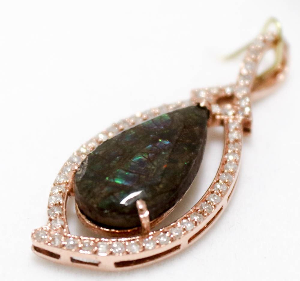 WITH LOCAL APPRAISAL, ONE PEAR SHAPED NATURAL AMMOLITE DOUBLET, 54 ROUND BRILLIANT CUT DIAMONDS, CLARITY GRADE I-2, COLOR GRADE H-I, TOTAL CARAT WEIGHT 0.65 CARATS, OVERALL LENGTH 43MM, TOTAL WEIGHT 5.70 GRAMS. SUGGESTED INSURANCE COVERAGE $4,000.00. JEWELLERY