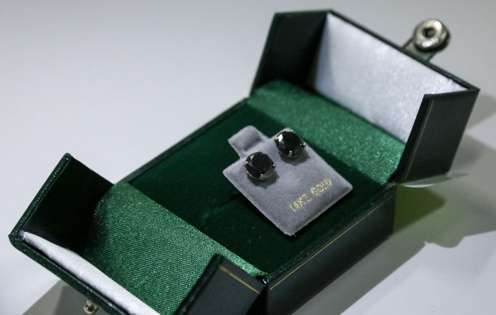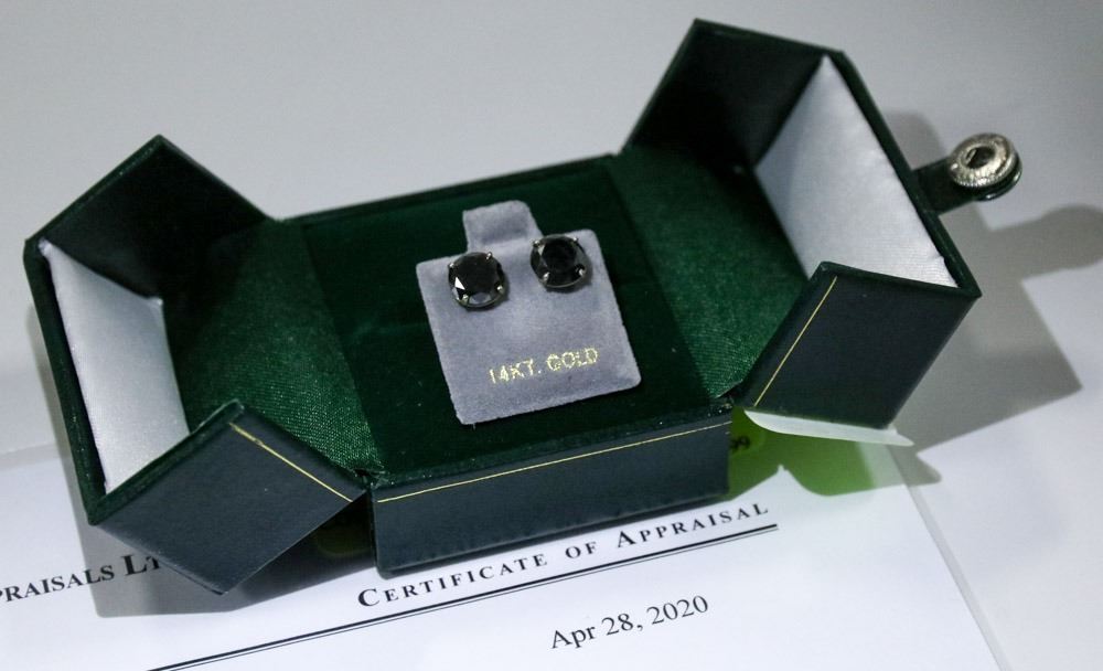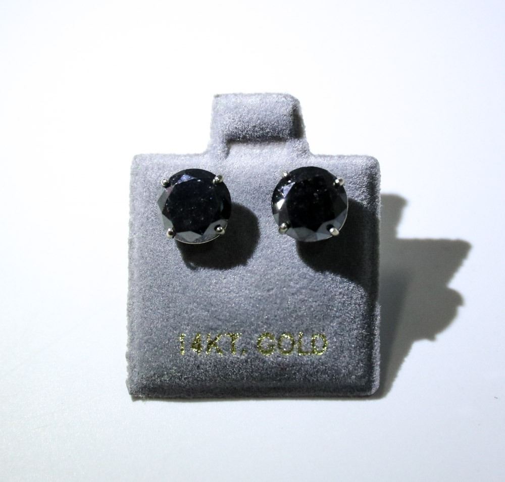 BLACK ROUND BRILLIANT CUT DIAMOND STUD EARRINGS. TWO FANCY COLOURED BLACK DIAMONDS, LABORATORY CLUR ENHANCED (MEASURING 7.46 AND 7.60MM) CLARITY GRADE OPAQUE. CARAT WEIGHT TOTAL 3.70 CARATS. TOTAL WEIGHT 1.60 GRAM. COMES WITH CERTIFICATE OFAPPRAISAL FROM LOCAL APPRAISER. SUGGESTED INSURANCE COVERAGE $1,500.00. JEWELLERY