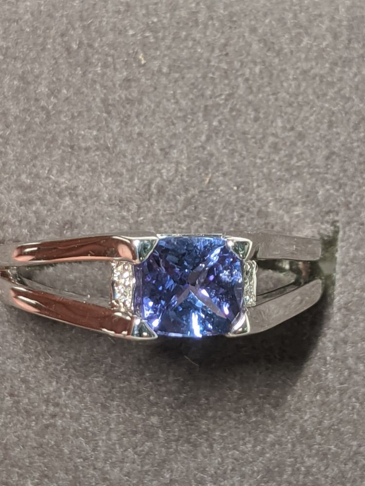 SIZE 8. CUSHION SHAPED NATURAL TANZANITE (MEASURING 6.02 - 5.95 X 3.76MM, TONE MEDIUM, HUE VIOLET/BLUE, CLARITY GRADE SI-1, WEIGHS 1.10 CARAT. SURROUND IS 4 BRILLIANT CUT DIAMONDS (MEASURING 1.10MM, CLARITY GRASE VS, COLOUR GRADEG-H, WEIGHS 0.04 CARATS.)COMES WITH CERTIFICATE OF APPRAISAL FROM LOCAL APPRAISER. SUGGESTED INSURANCE COVERAGE $2,500.00. JEWELLERY