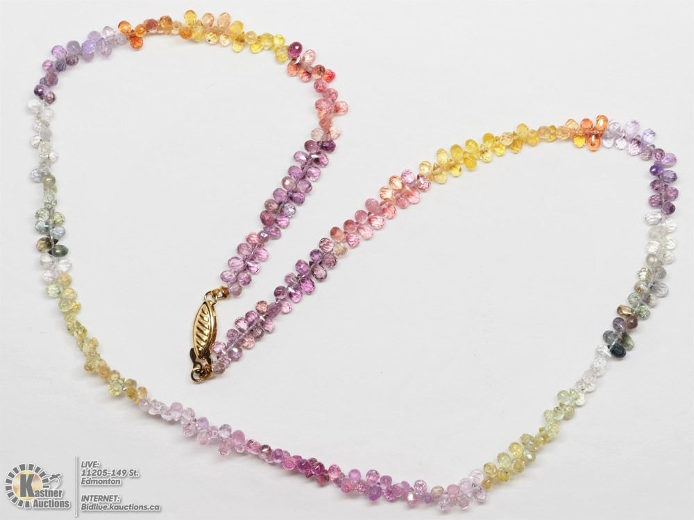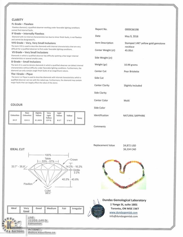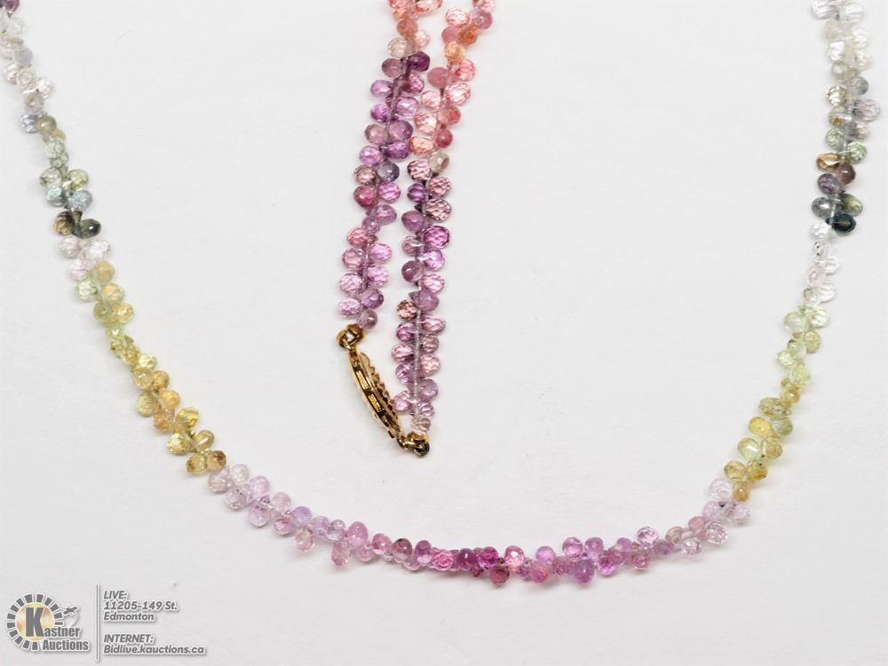 06 - GS91 - 14KT YELLOW GOLD MULTI-COLOUR SAPPHIRE (45.00CT) 16" NECKLACE W/COA. SUGGESTED REPLACEMENT VALUE $6,334.00. JEWELLERY