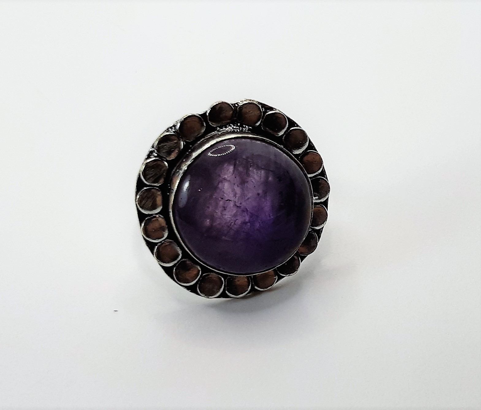 STONE IS A CABACHON(NOT FACETTED) AND SETTING HAS FLATTENED HASMMERED DESIGN SURROUNDING THE STONE, SIZE 9. JEWELRY