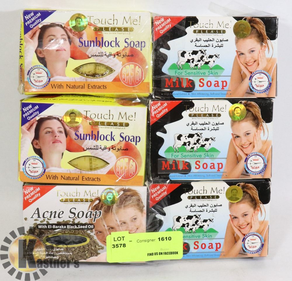 6 BARS OF ASSORTED SOAP, SOME SUNBLOCK