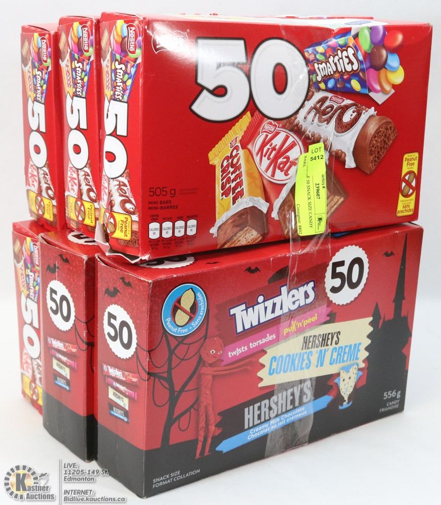 6 BOXES OF 50 SNACK SIZE CANDY BARS.
