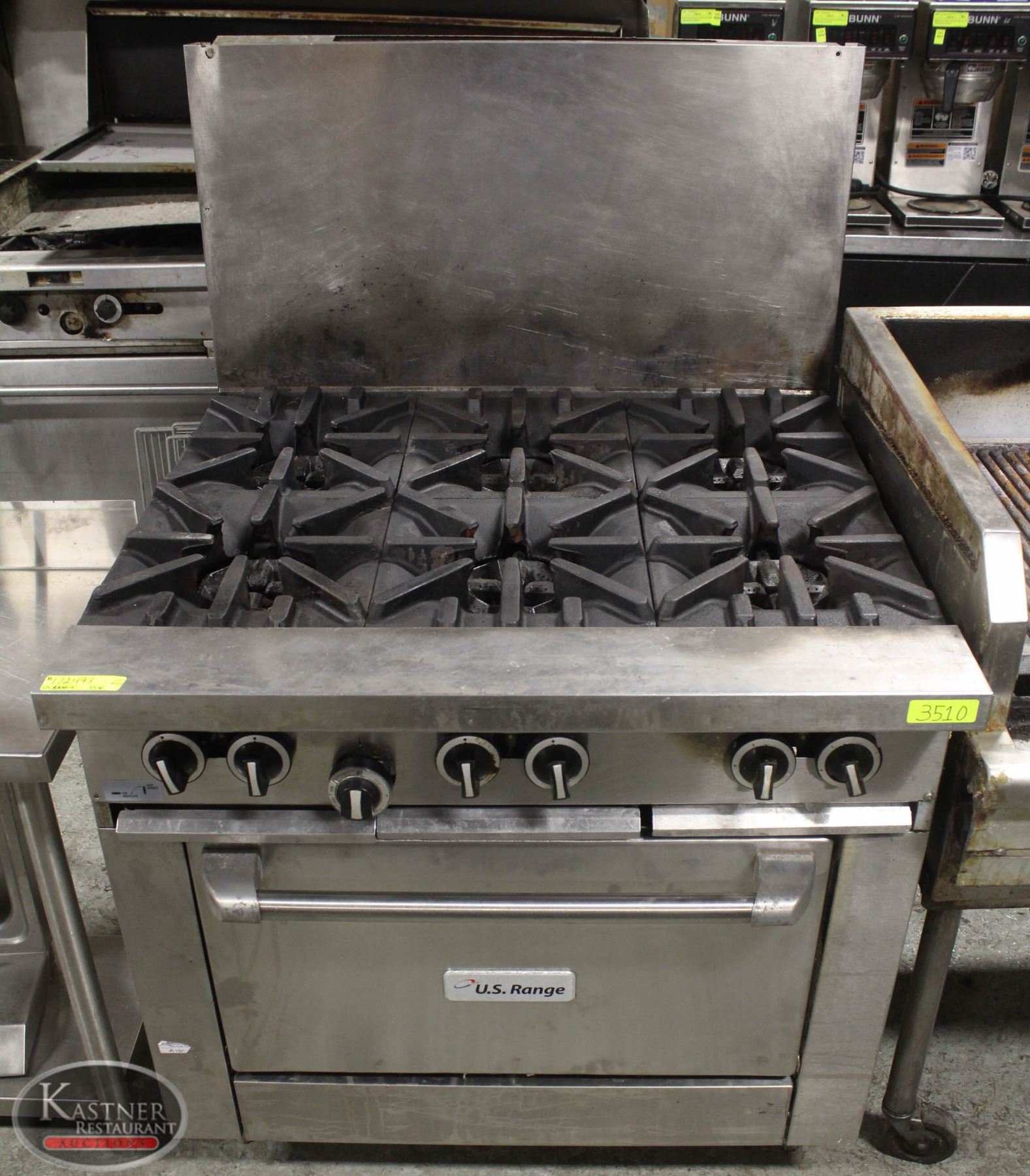6 BURNERS W/ LARGE OVEN, ALL BURNERS INTACT. M# U36-6R, NSF APPROVED, ADJUSTABLE LEGS. 35.5" X 35" X 36" (55" W/ BACKSPLASH)