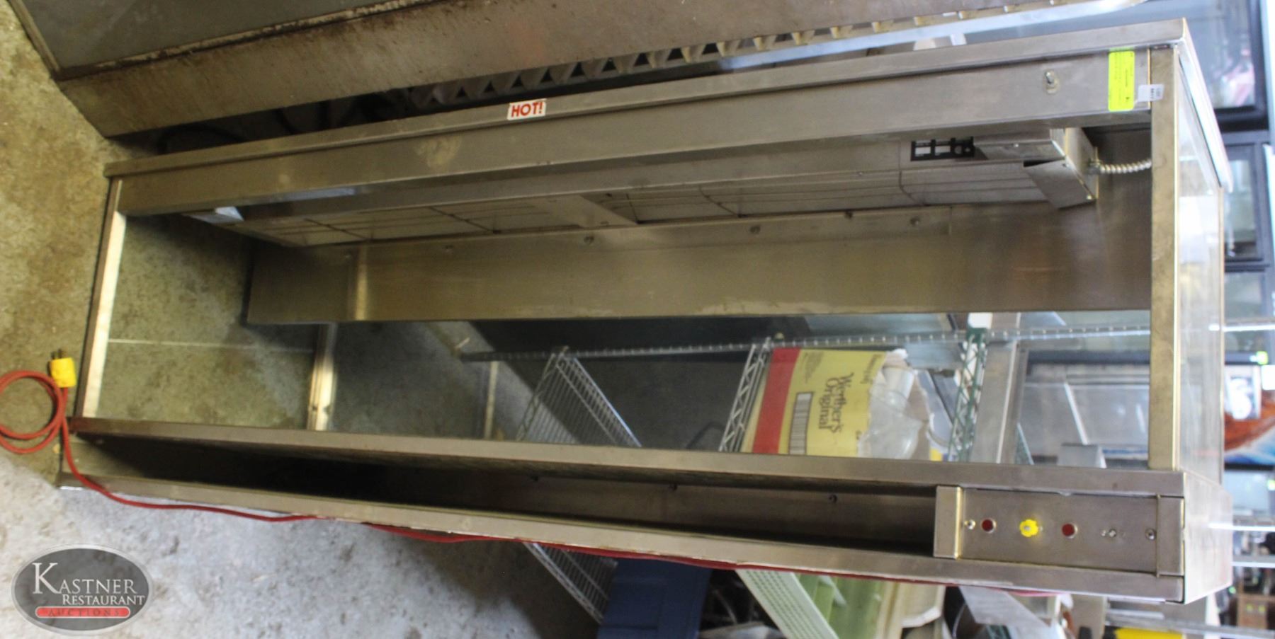 W/ GANN INFRARED WARMING LAMP M#: FWC-6(120V & 11.7A), INCLUDES FLUORESCENT LIGHT, 3 GLASS SIDES, FOOD MIRROR PAN STORAGE. *CONNECT TO POWER SOURCE-UNTESTABLE* 72" X 24" X 23-1/2"