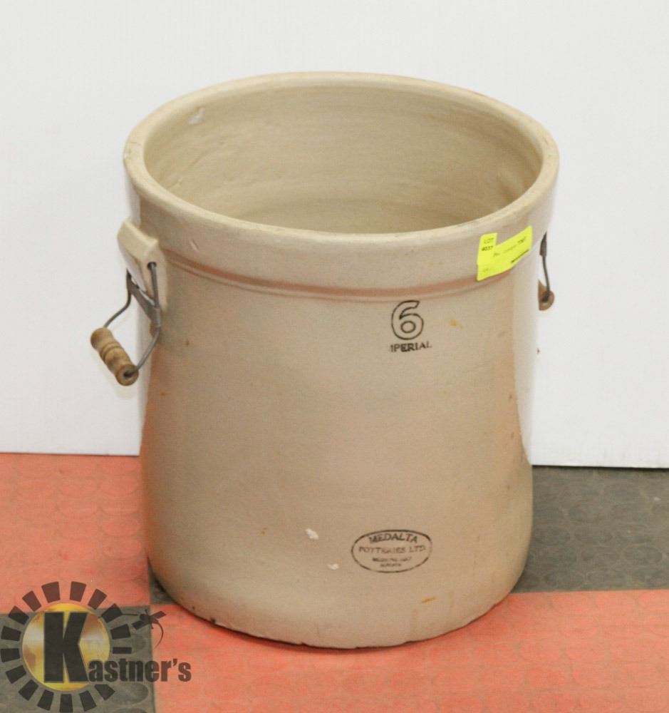 6 GALLON MEDALTA POTTERIES CROCK, NO LID